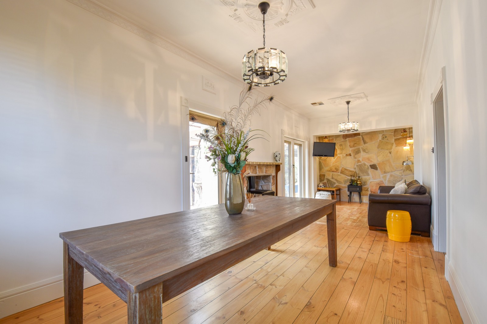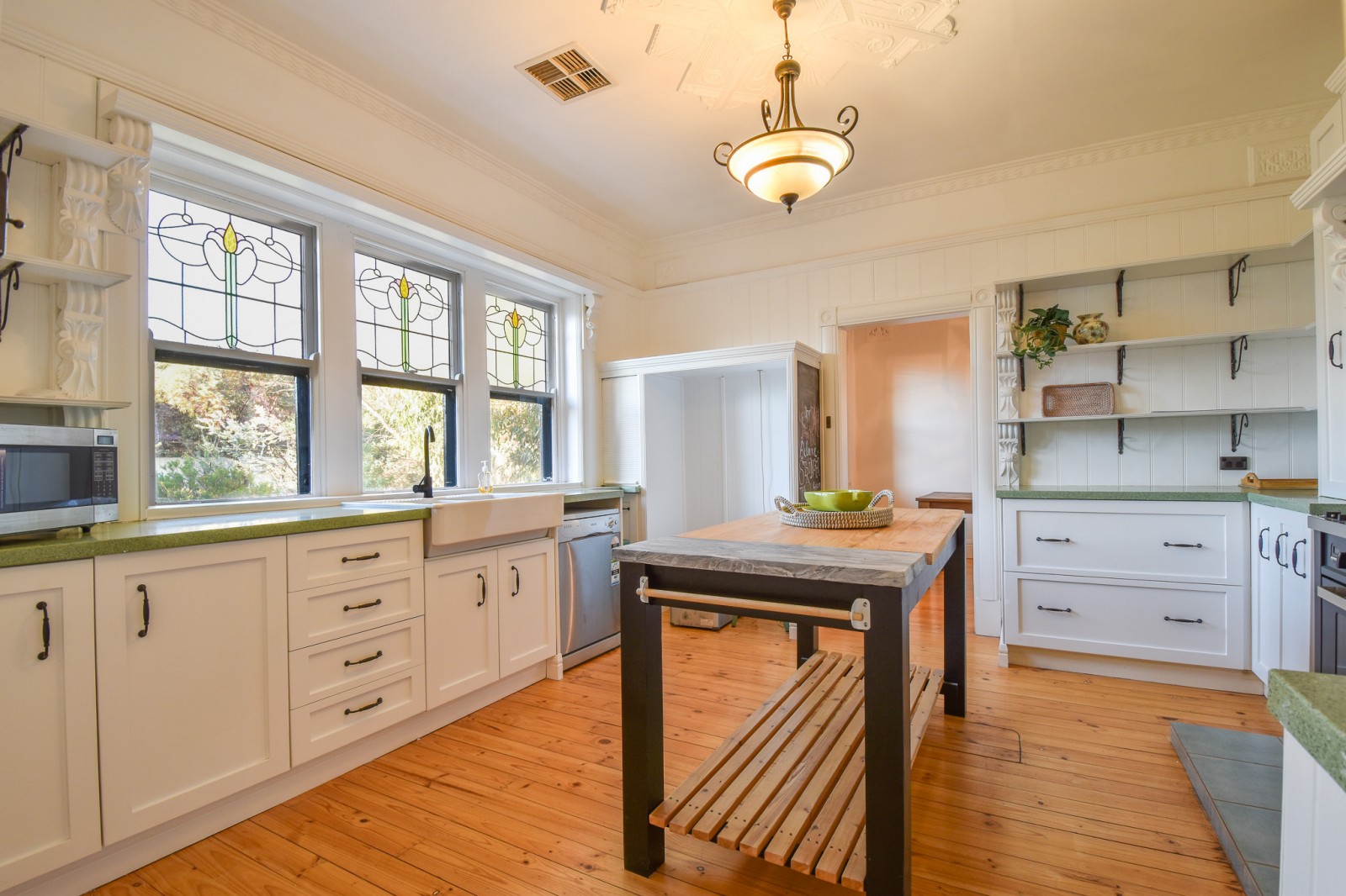 The heart of the home lies in the expansive white kitchen, boasting elegant stone benchtops, a large window with a stained-glass feature that bathes the space in natural light, a large gas cooktop and electric oven with a stainless steel extraction fan and a dishwasher. This space seamlessly connects to the open-plan living and dining area, where a slow combustion wood fire, framed by a striking sandstone surround and feature wall, creates a cozy atmosphere. Dual access to the outdoor entertaining area creating ease between indoor-outdoor living.