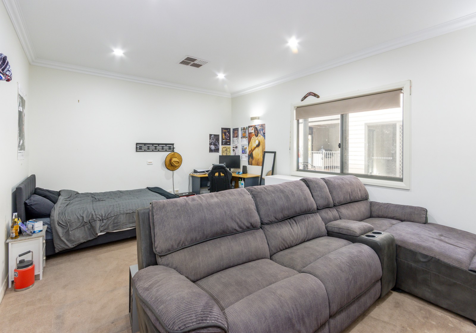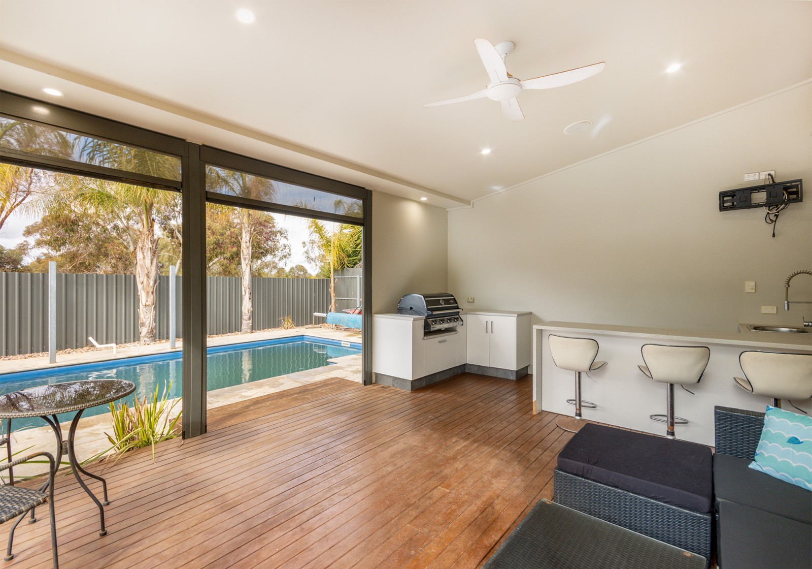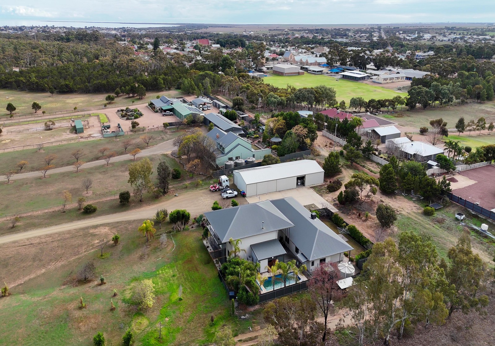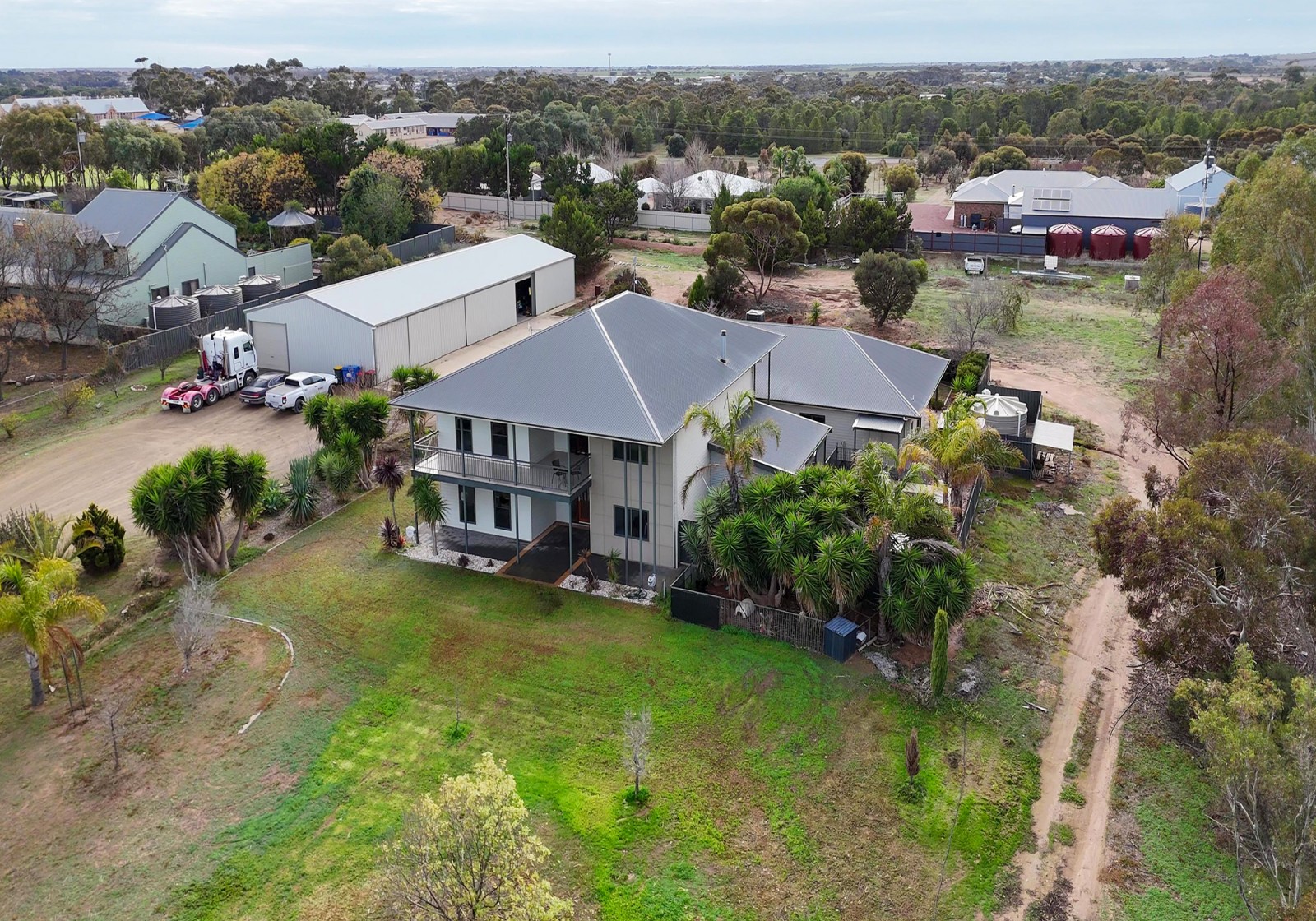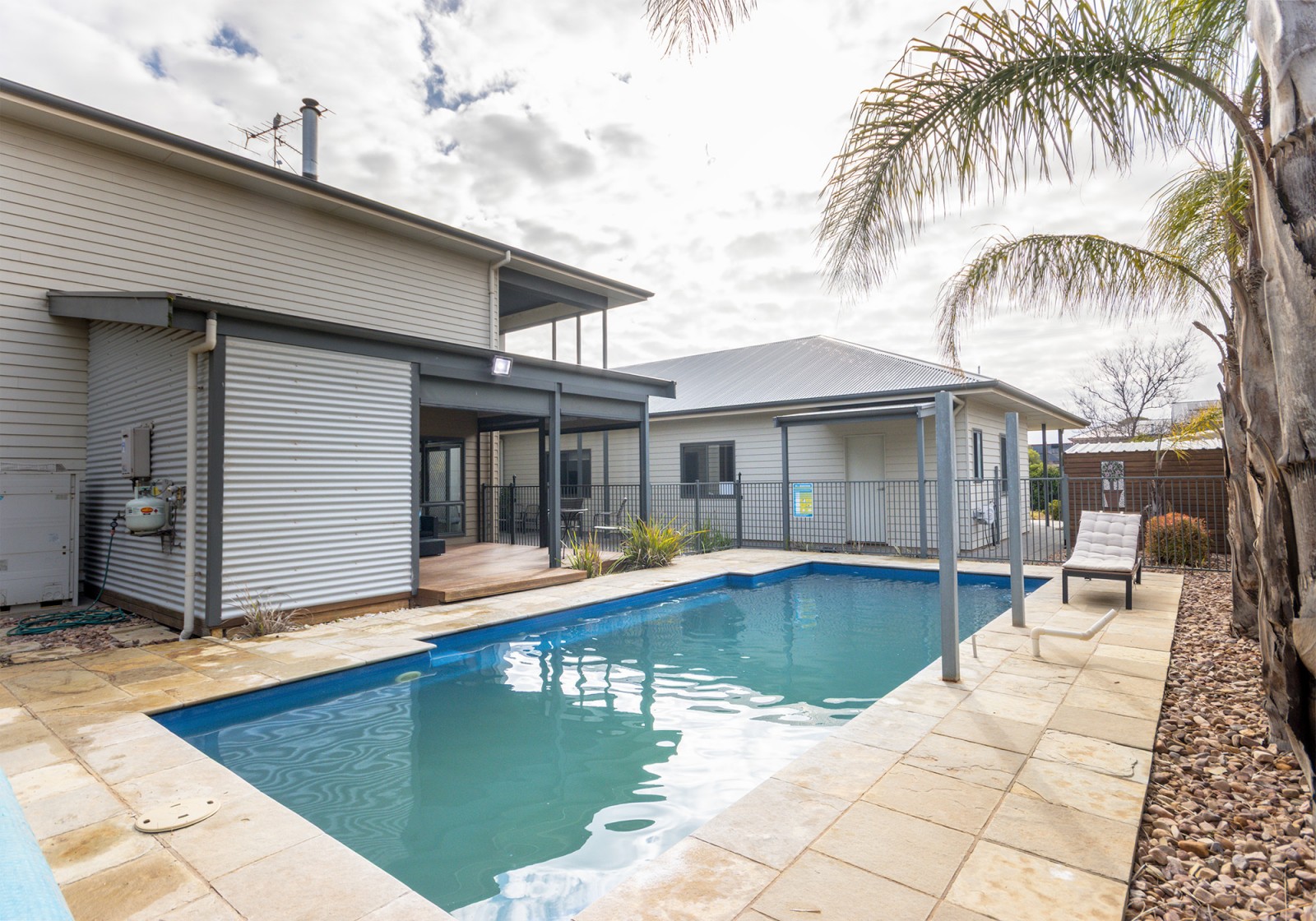 Nestled on a generous 1.67ha allotment just minutes from the heart of Moonta, this 2009 built masterpiece offers 7-bedrooms, 2 bathrooms and 4 toilets. A rare opportunity for growing families, lifestyle seekers, or investors looking for versatility and potential. The ground floor features an expansive open-plan living and dining area, ideal for large family gatherings or entertaining guests. A modern kitchen takes centre stage with quality electric appliances, glossy black tiled splashback, ample cupboard and bench space, and a large island bench complete with twin sink, dishwasher, storage and breakfast bar. A large walk-in pantry provides additional shelving and appliance space, while stylish tiling flows throughout the home. Year-round comfort is assured, with reverse cycle heating and cooling servicing the front of the home and evaporative cooling providing airflow to the rear. A combustion heater also adds warmth and ambience during the cooler months. Four spacious bedrooms with built-in robes, a separate cinema room perfect for movie nights, a dedicated study, and a large laundry with plenty of storage. The stylish family bathroom is nothing short of luxurious, with a walk-in waterfall shower, freestanding island bath, and double vanity with additional storage nearby. Polished timber stairs lead you to the private upstairs retreat, where the master suite is perfectly positioned to capture sweeping views. Enjoy a generous walk-in robe, private ensuite, and peaceful separation from the rest of the home. An additional upstairs bedroom or home office provides even more flexibility, along with access to the balcony overlooking the coastal landscape. Outside is where this property really shines for entertainers and families alike. A stunning undercover alfresco area comes complete with decking, built-in BBQ, bar and sink – all overlooking the fully fenced inground salt-chlorinated pool surrounded by established palm trees and paved grounds, creating your very own resort-style escape. A fourth toilet nearby adds extra convenience for poolside entertaining.