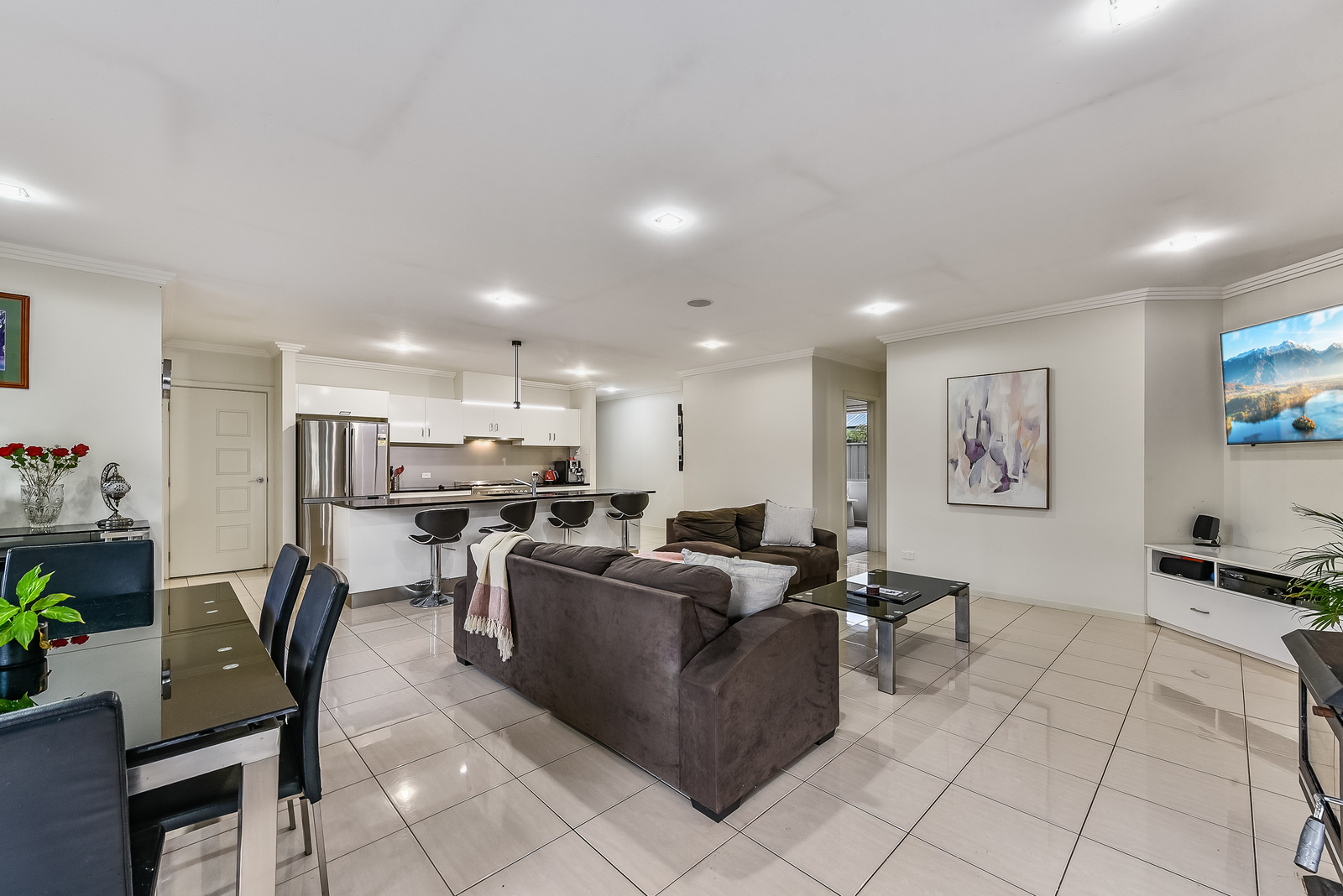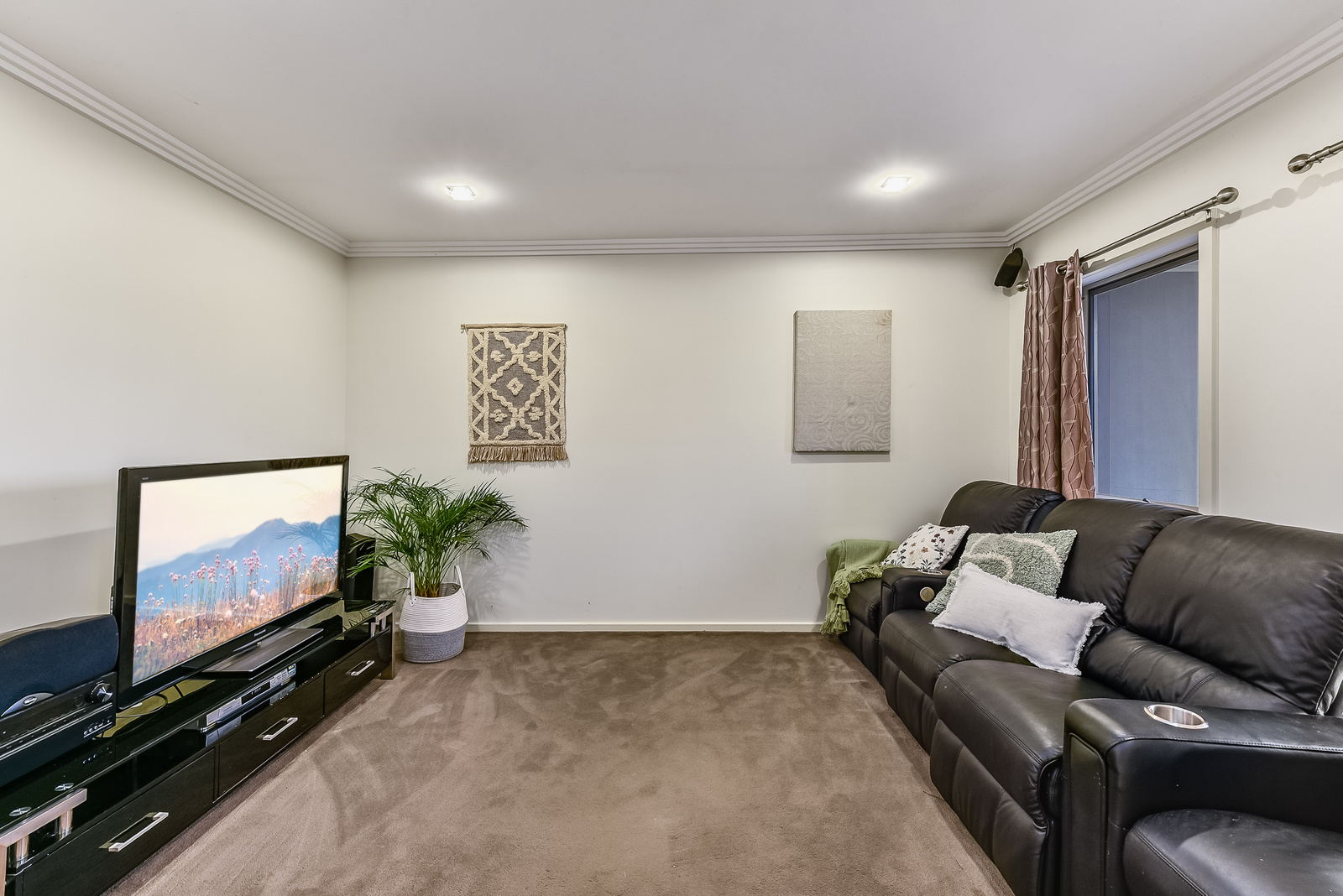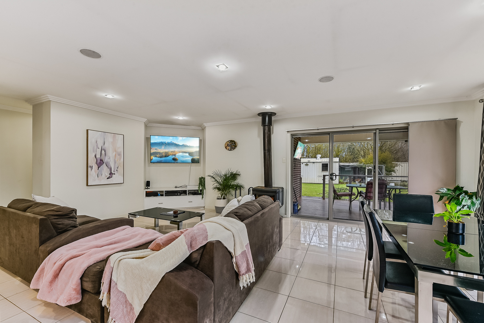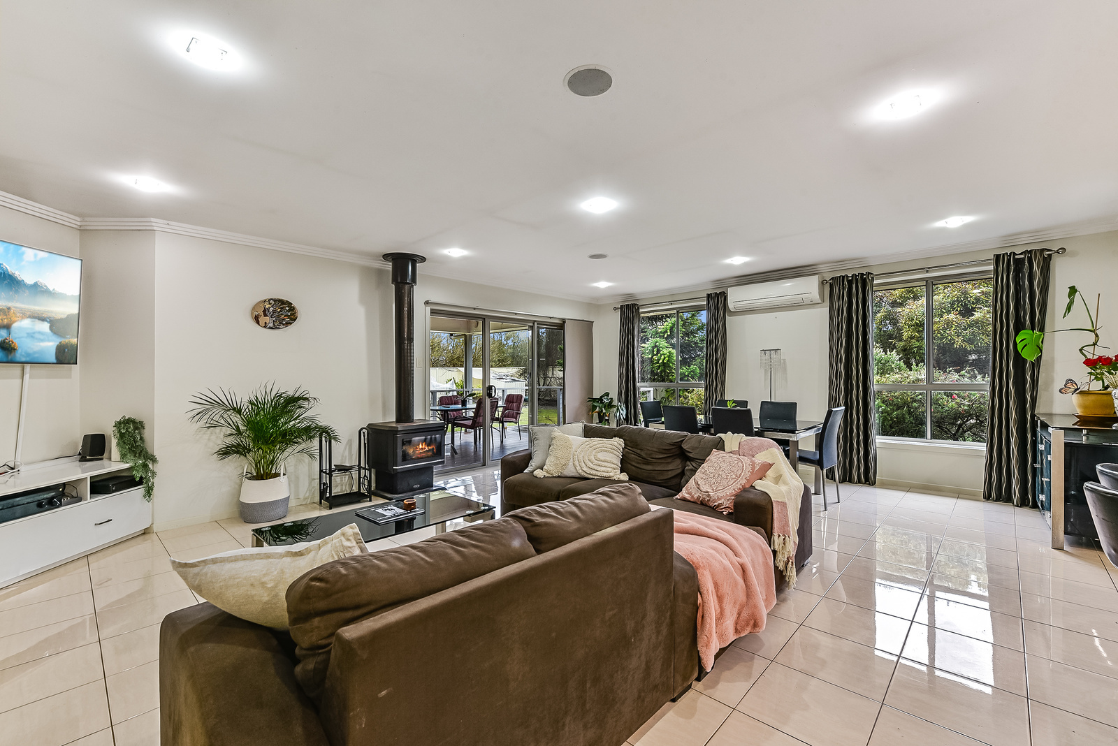 The heart of the home is the expansive open-plan kitchen, living, and dining area. Finished with neutral tones and tiled flooring, this space is flooded with natural light and anchored by a large island bench, 90cm oven, walk-in pantry, dishwasher, and ample cabinetry. A slow combustion fire adds warmth and charm, while a split system ensures year-round comfort. Just off the main living space is a second lounge or media room - perfect for movie nights or kids' playtime. This area seamlessly connects to a double bay garage with remote roller door.