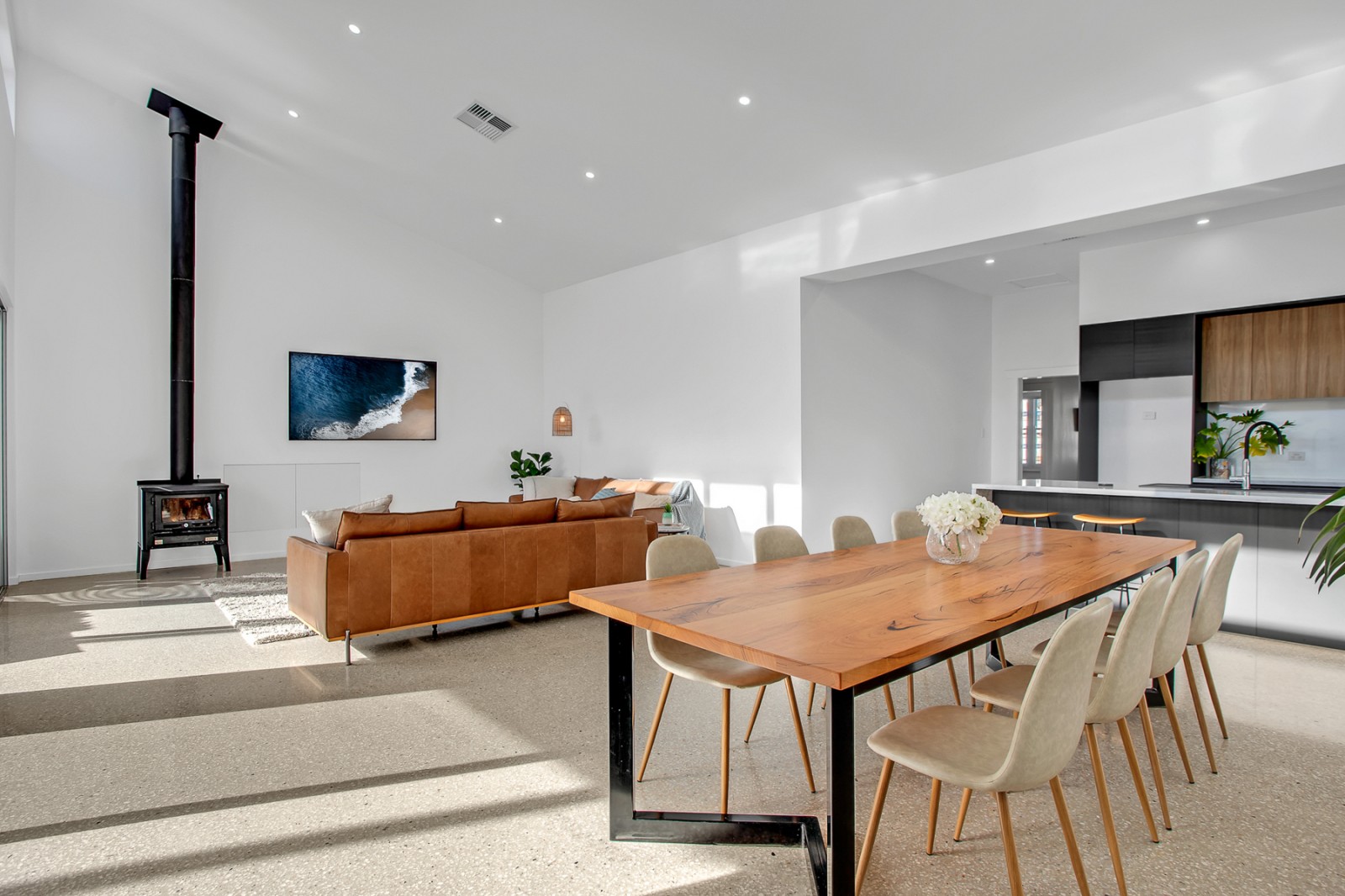 - Polished concrete floors in neutral tones with underfloor heating