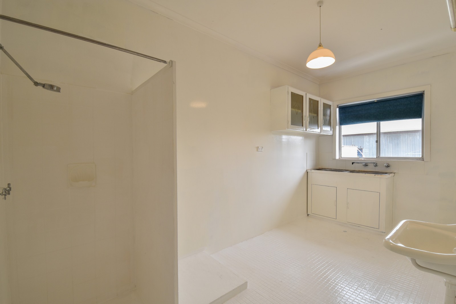 The laundry includes a tiled floor, hand basin, shower and a double stainless steel washtub.