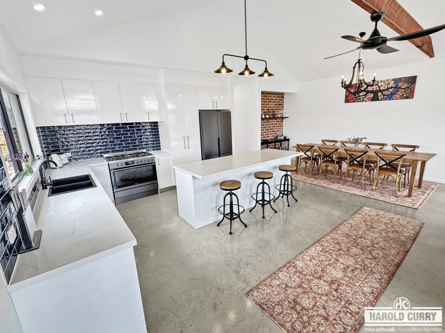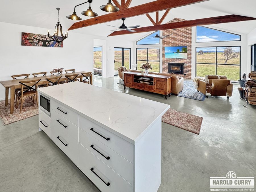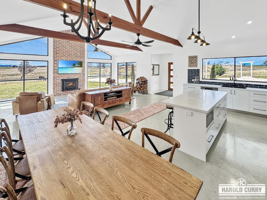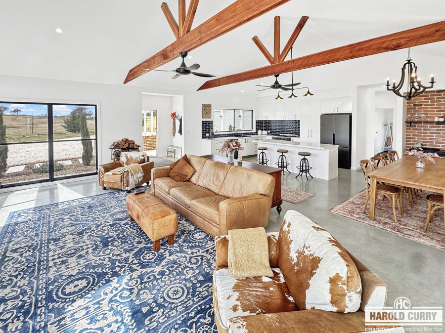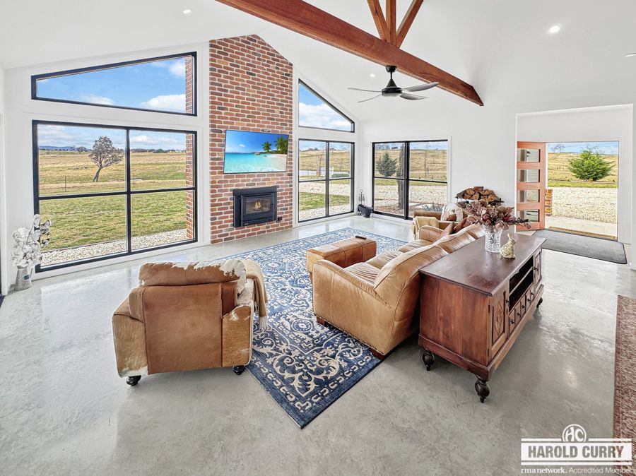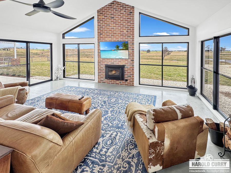 From the moment you step inside, the wow factor is undeniable. Soaring cathedral ceilings with exposed timber trusses, striking brick feature walls, polished concrete floors, and expansive floor-to-ceiling windows frame breathtaking views of the surrounding landscape, creating a warm and dramatic living space.