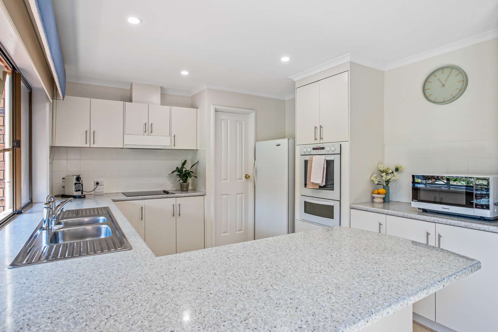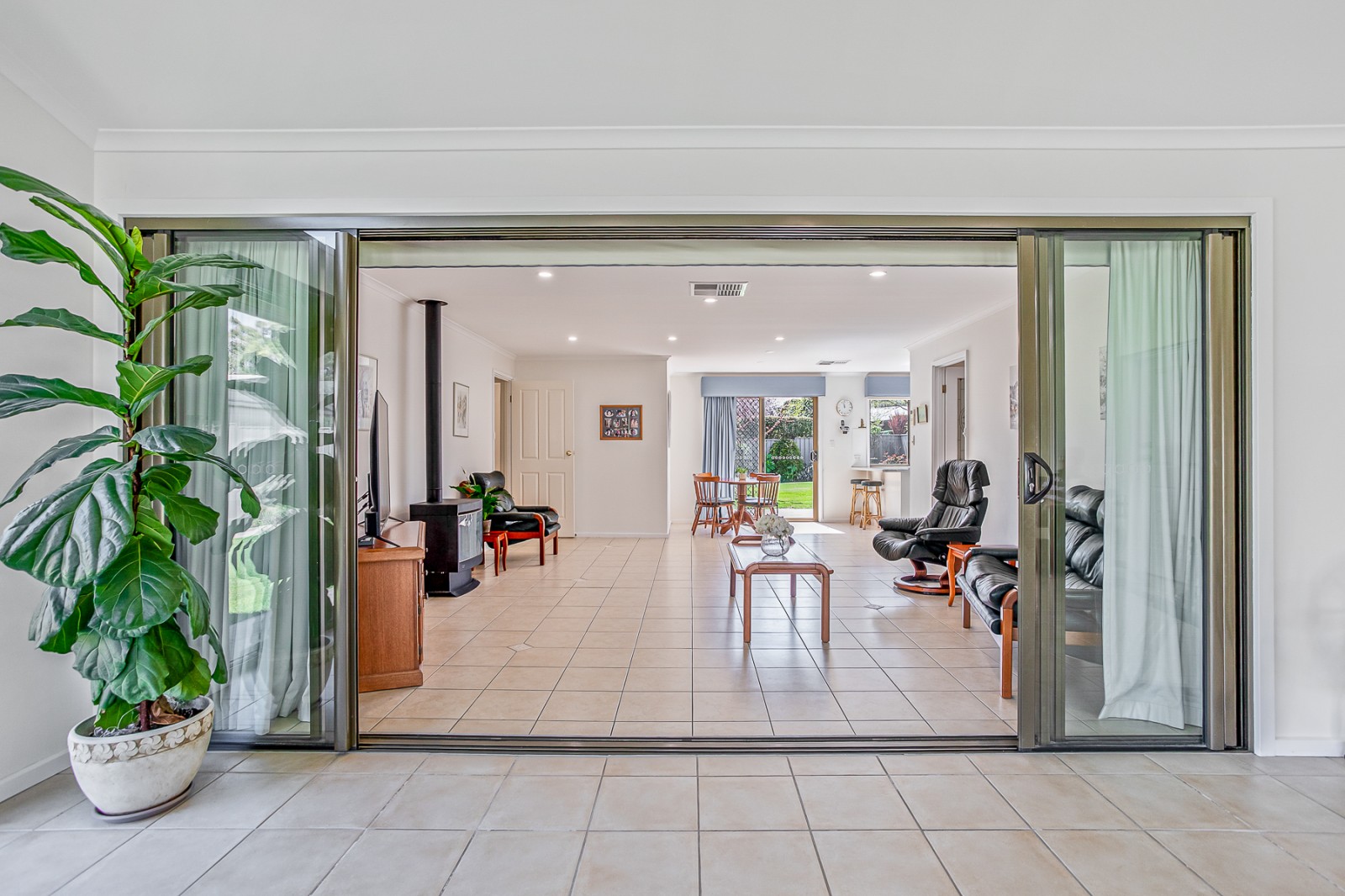 - Open-plan tiled kitchen, dining, and family area. The kitchen is complete with a walk-in pantry, double sink, in-wall oven with warming drawer, dishwasher, and ample bench space. A gas fireplace and reverse-cycle air conditioner ensure year-round comfort. This area flows effortlessly to an outdoor entertaining space, ideal for summer BBQs and garden views.
