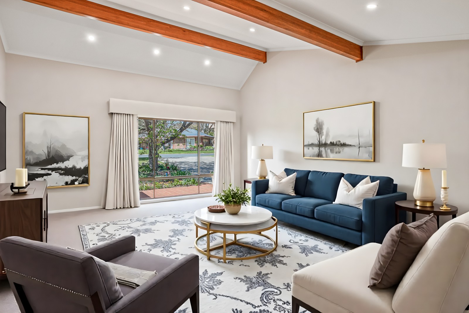 - A very spacious formal lounge and sitting area at the front of the home, featuring beautiful timber beams and raked ceilings, plus additional space which would make the perfect space for a bar, library, or quiet retreat.