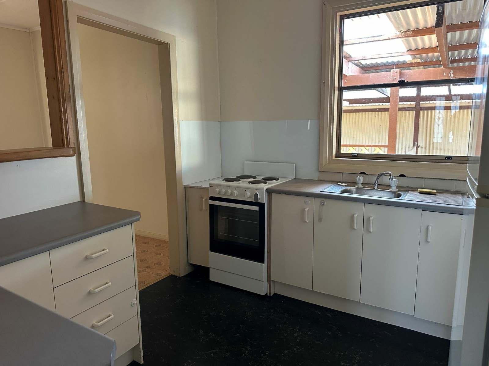 - Kitchen lino floor, laminate cabinetry and benchtop, freestanding electric oven/cooktop