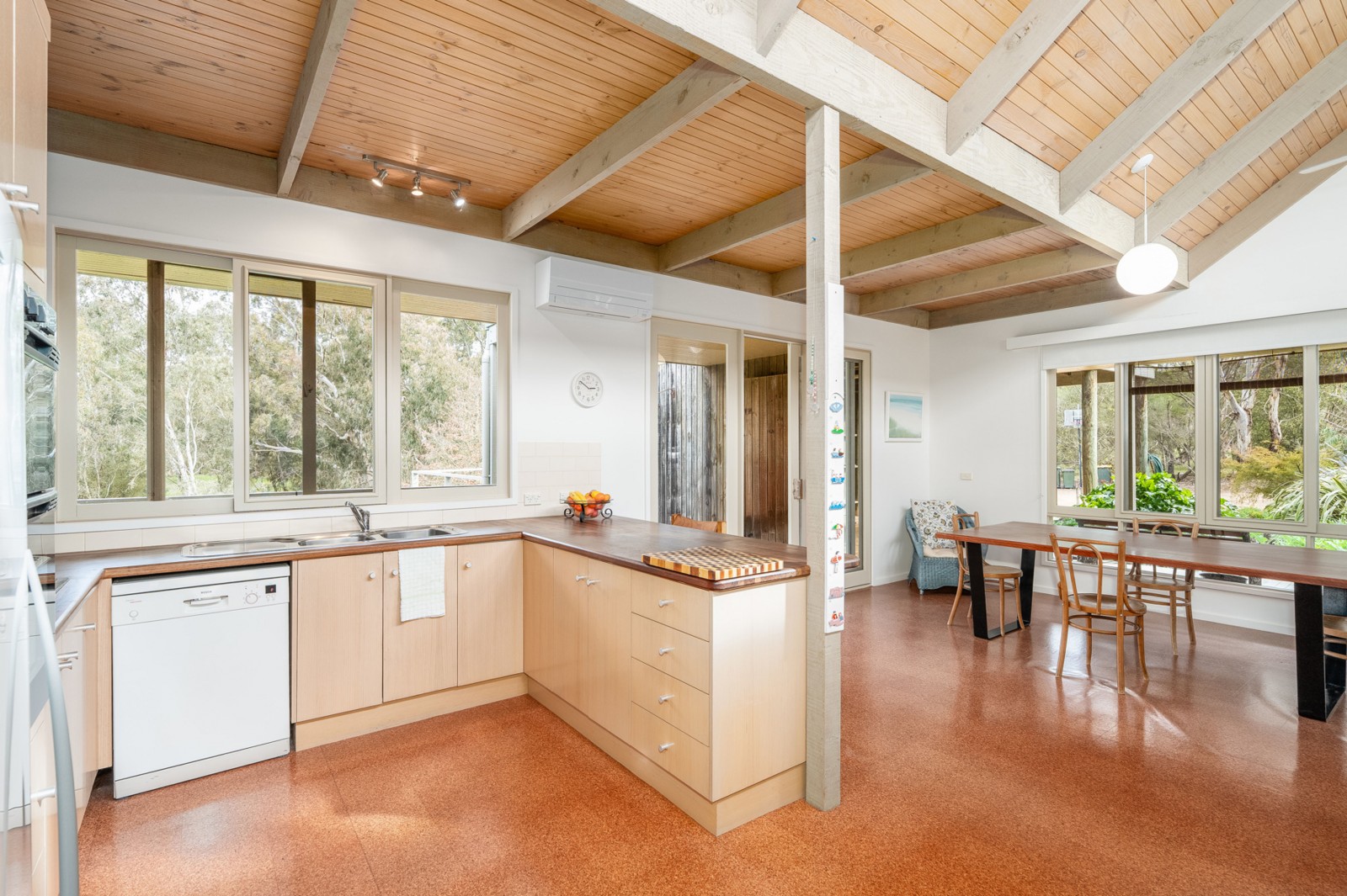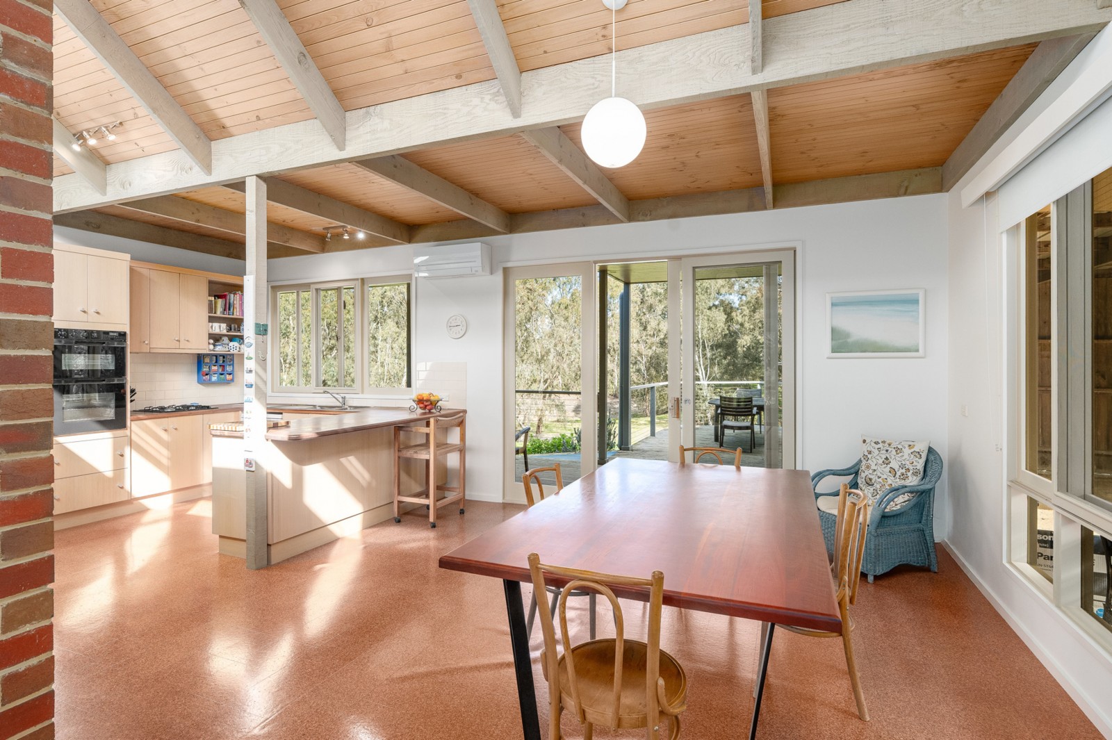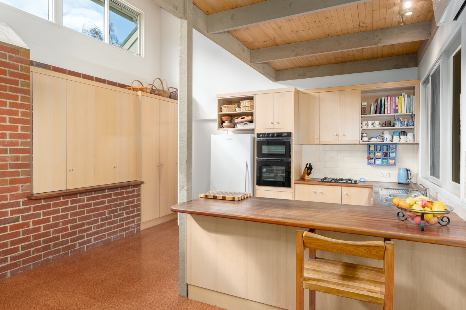 The kitchen enjoys warm natural light and views over the gardens towards the river, copious built-in-storage and a large dining space. A seamless connection from the dining space through to the family lounge makes this section the heart of the home, featuring a north-facing, sunlit open space with a wood heater on a feature brick wall for added thermal mass, which adds to the sustainability principles that feature throughout this home.
