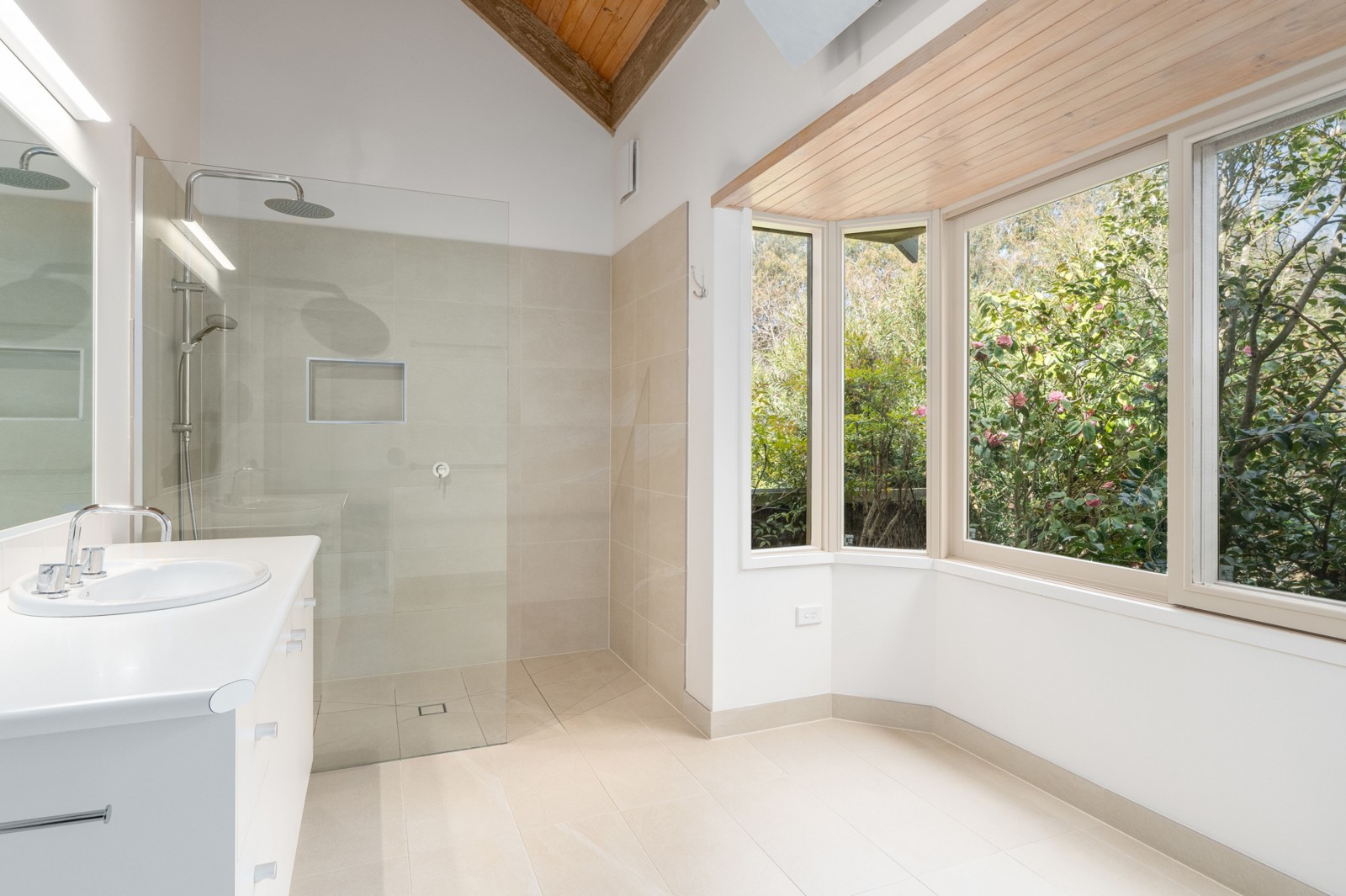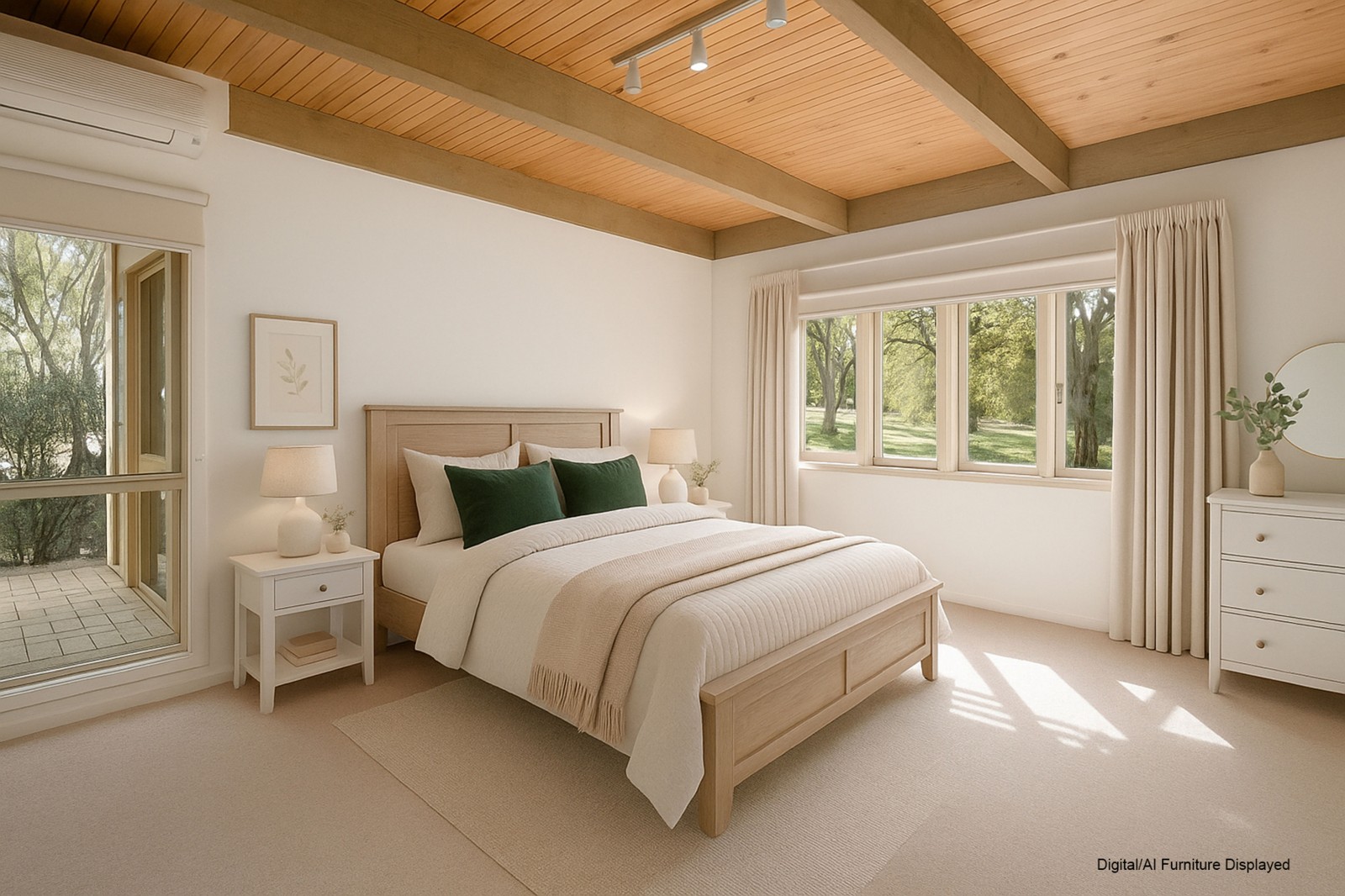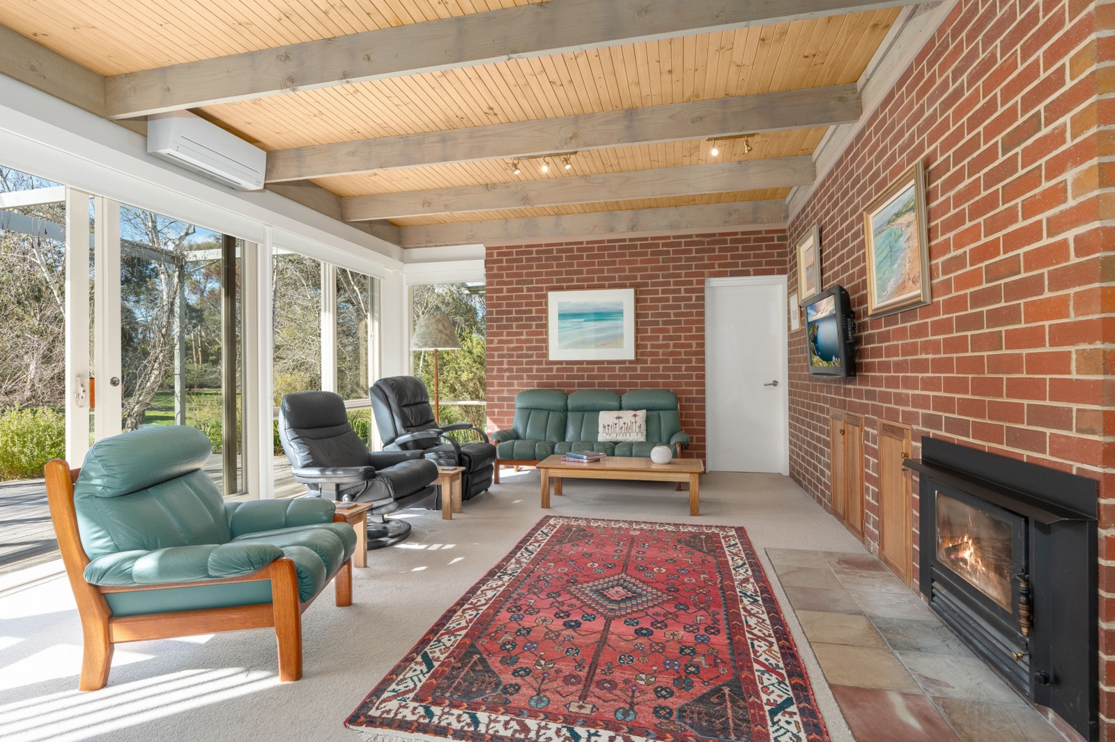 The kitchen enjoys warm natural light and views over the gardens towards the river, copious built-in-storage and a large dining space. A seamless connection from the dining space through to the family lounge makes this section the heart of the home, featuring a north-facing, sunlit open space with a wood heater on a feature brick wall for added thermal mass, which adds to the sustainability principles that feature throughout this home.