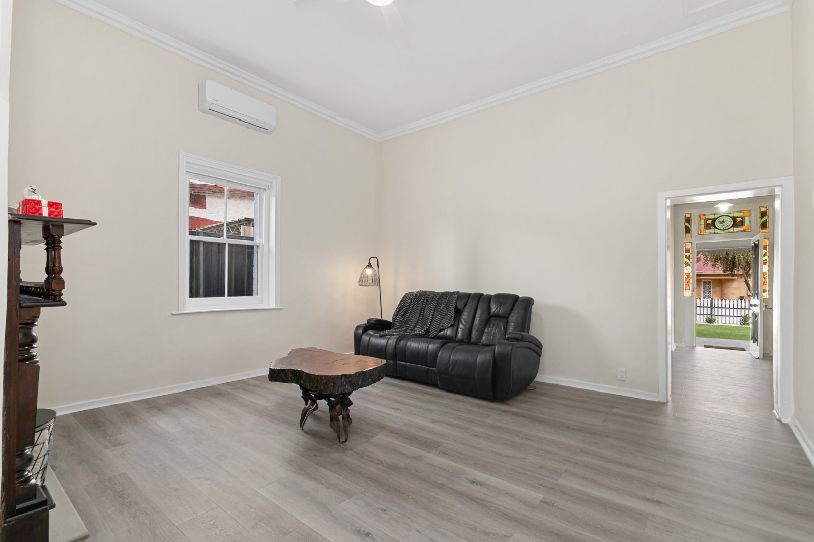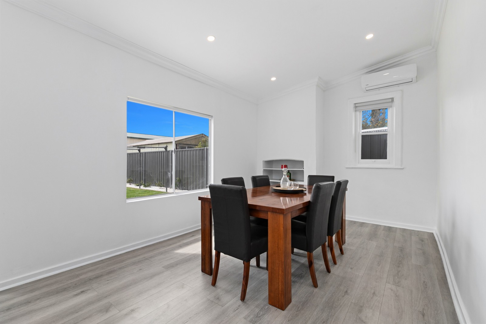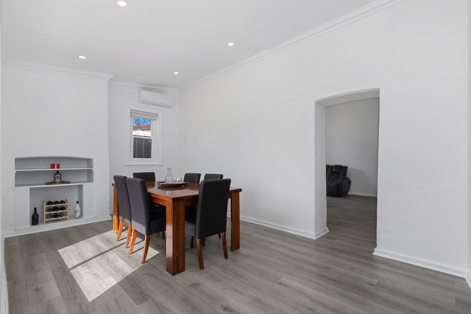At the centre of the home lies a spacious lounge, filled with natural light and character. A mantlepiece, new flooring, split system air conditioner and ceiling fan create the perfect haven for family nights or quiet relaxation. The stylish dining room flows seamlessly from here — a space to share stories, laughter, and late-night conversations.