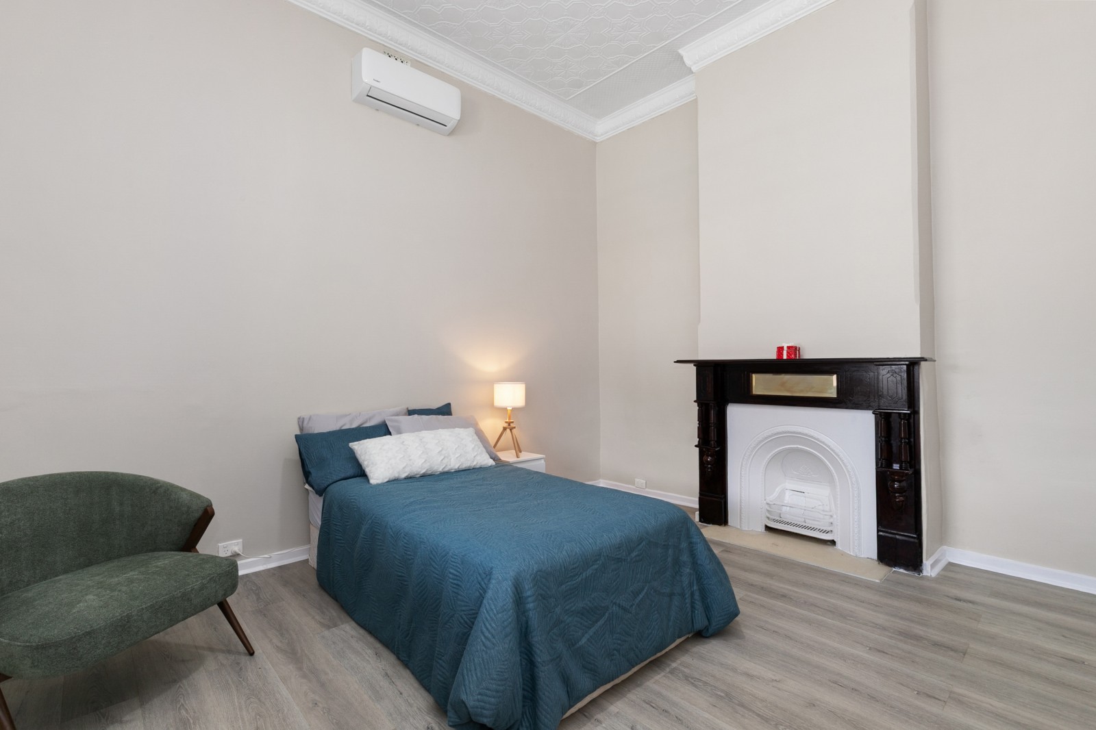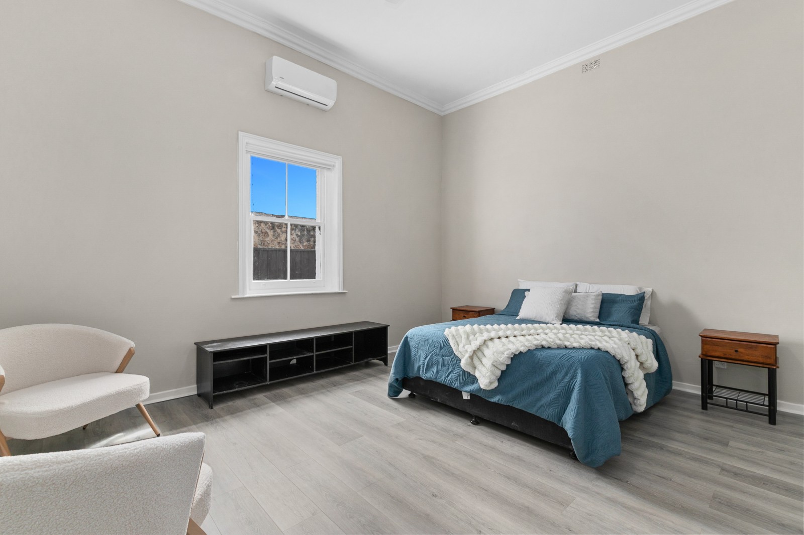 Beyond the classic white picket fence, a story unfolds. Step inside to find three bedrooms, two adorned with exquisite, pressed tin ceilings — a nod to the home’s historic soul. Each room feels warm and inviting, complete with new flooring, ceiling fans, and split system air conditioning, ensuring comfort in every season.