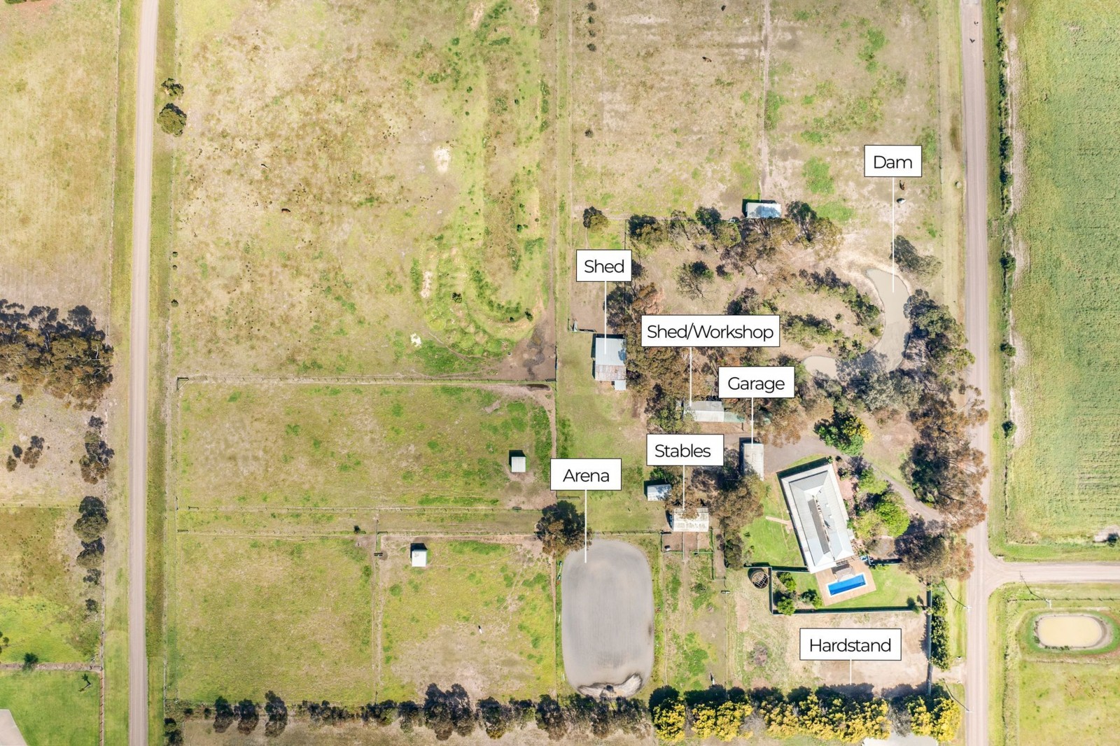 - 8 main paddocks perfect for agistment and equine activities, 3 horse shelters, x1 dam, paddock troughs connected to town water, horse arena and triple road frontage (Woods Road, Coppards Road and Hampton St)