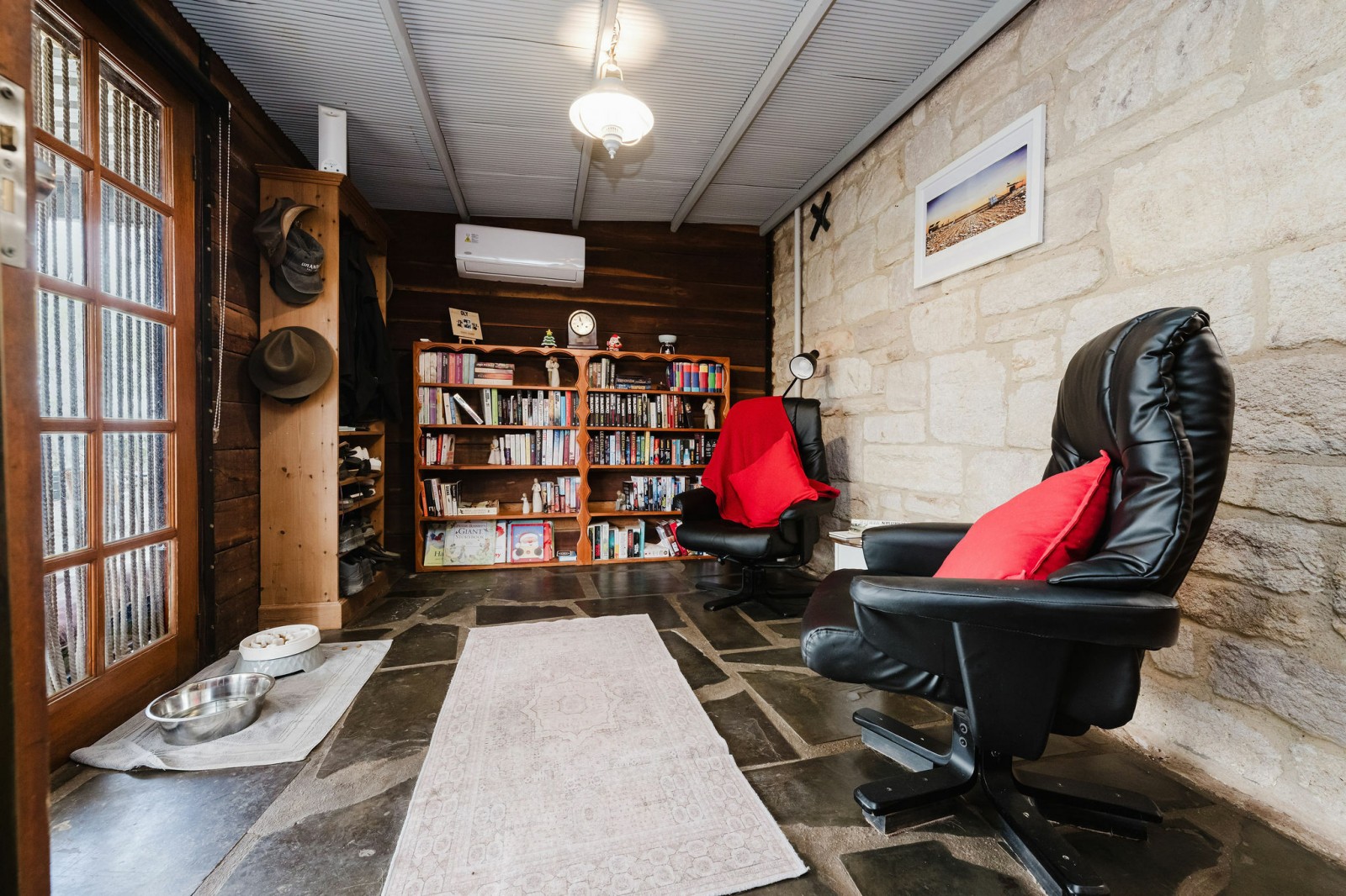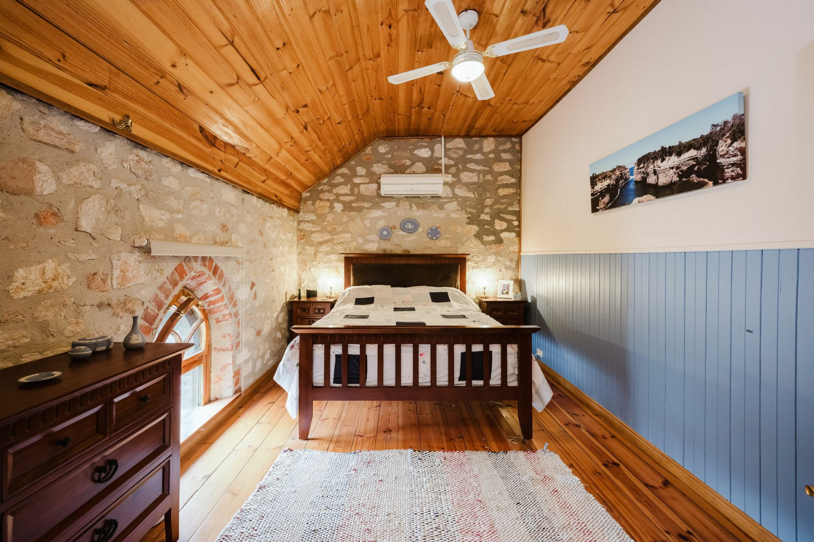 This character stone church is a landmark in the area, with a splendid handcrafted kitchen with slate bench tops and recycled timber. Large living area with leadlight windows, soaring ceilings, stone feature walls, combustion heater, front porch and Baltic pine/slate flooring. Feature woodwork, doors & windows compliment the property. A stunning wooden staircase leads to the beautiful mezzanine floor with two air conditioned bedrooms. Tastefully renovated bathroom with feature stone walls, and dining room with French doors and pergola area with enclosed yard.