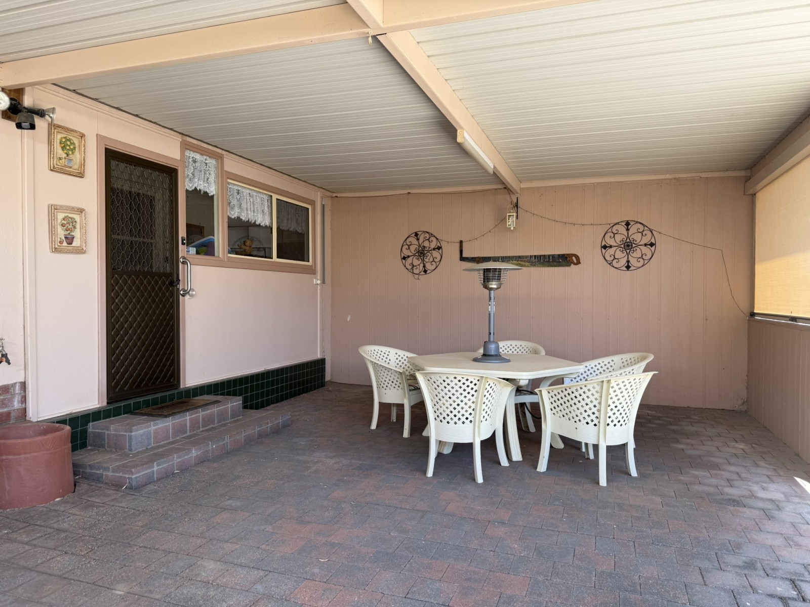 Outdoors, the home continues to impress with a large paved undercover entertaining area, complete with blinds for privacy and wind protection—ideal for family gatherings year-round. The steel-framed shed features a concrete floor, power, workbench, and a potter’s kiln, offering unique versatility for hobbies or home business use.