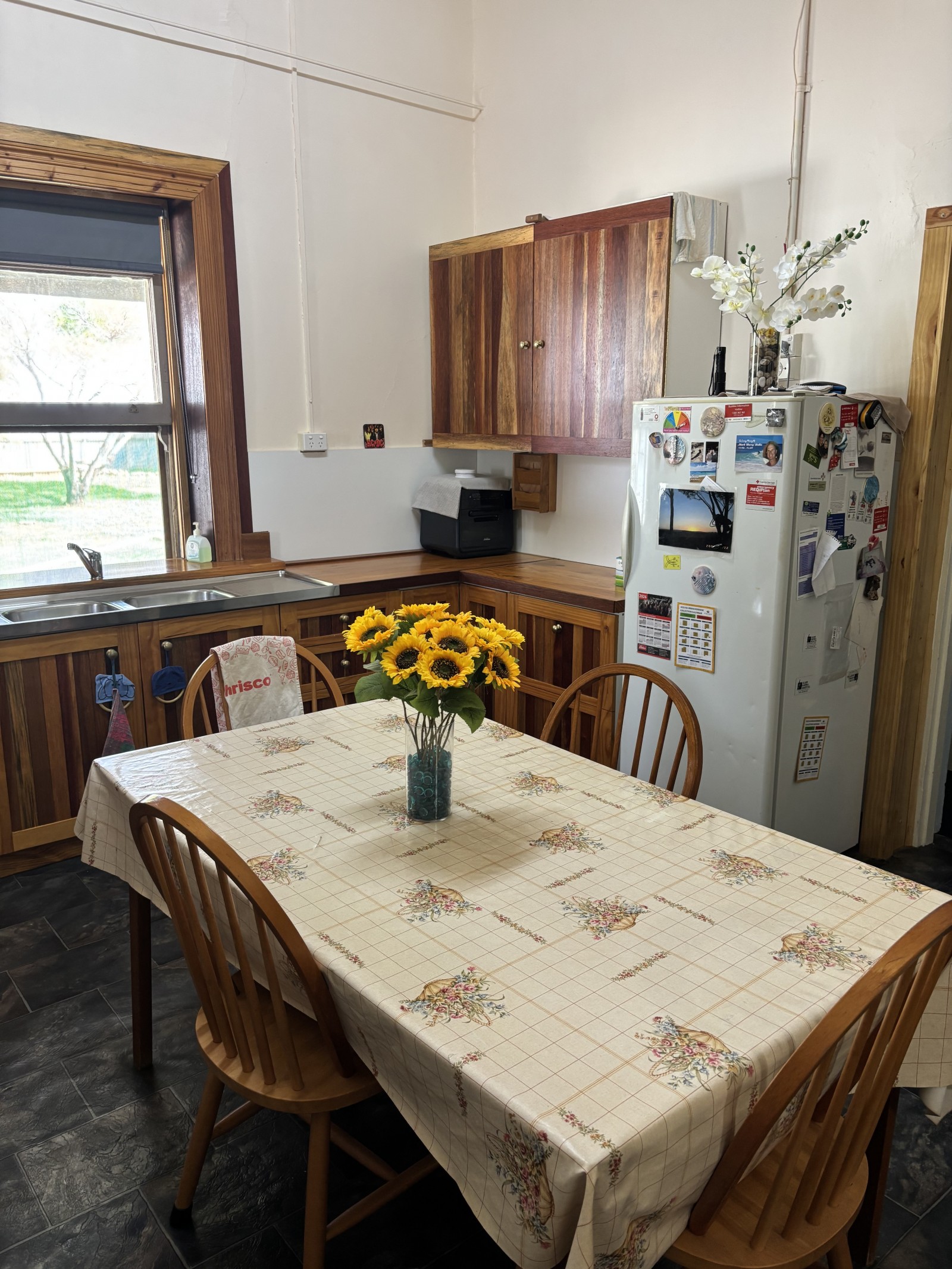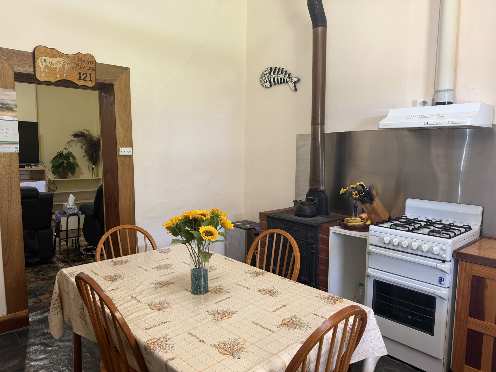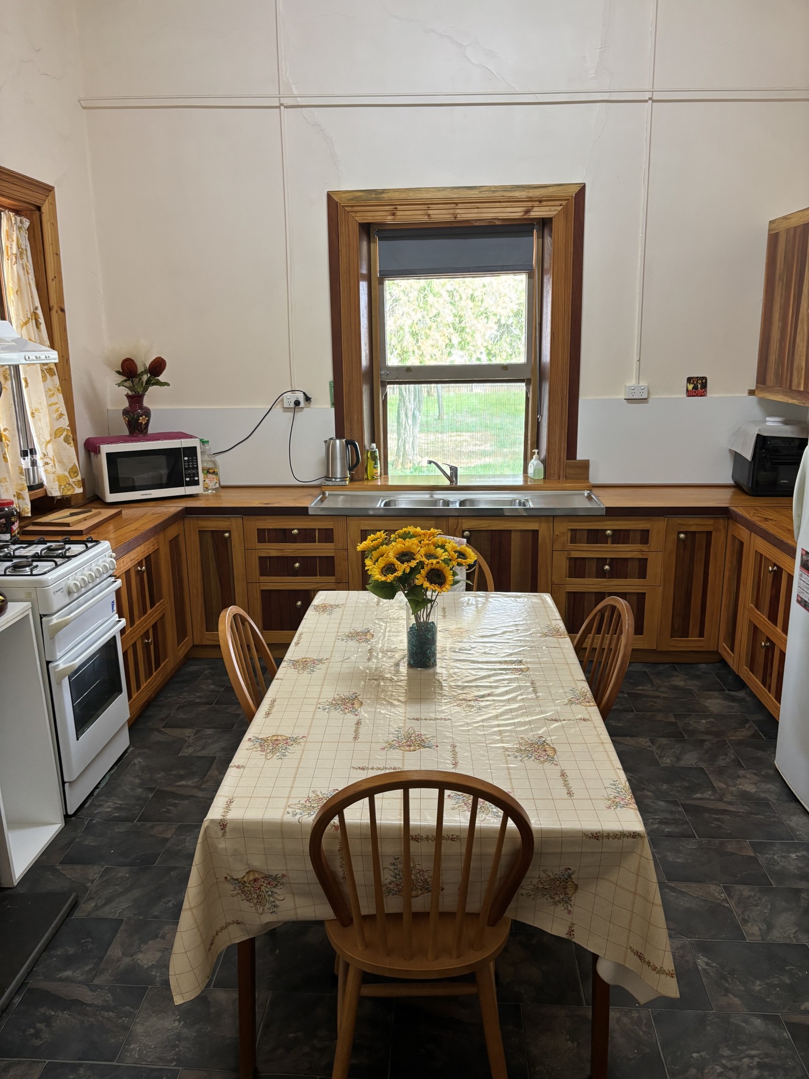 At the heart of the home, the handcrafted timber kitchen is rich in character, offering timber cabinetry and benchtops, a corner pantry, wood-fired oven, gas oven, and a double-bowl sink overlooking the private rear yard.