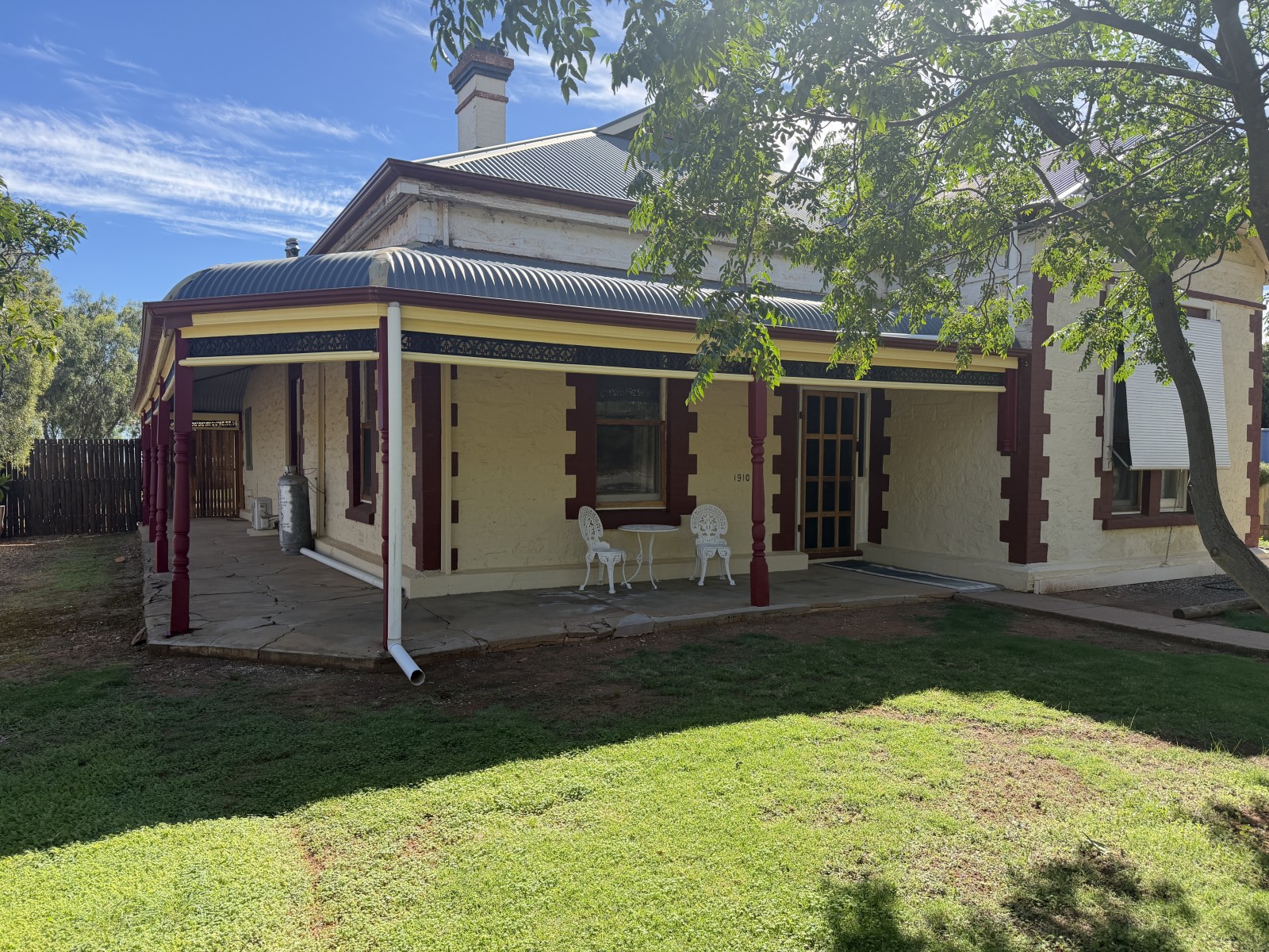 This charming 1910* stone villa showcases a classic bullnose return verandah, beautifully adorned with decorative lacework, leadlight windows, and lofty pressed-tin ceilings. A wide central hallway with Baltic pine flooring immediately sets the tone, highlighting the home’s timeless character.