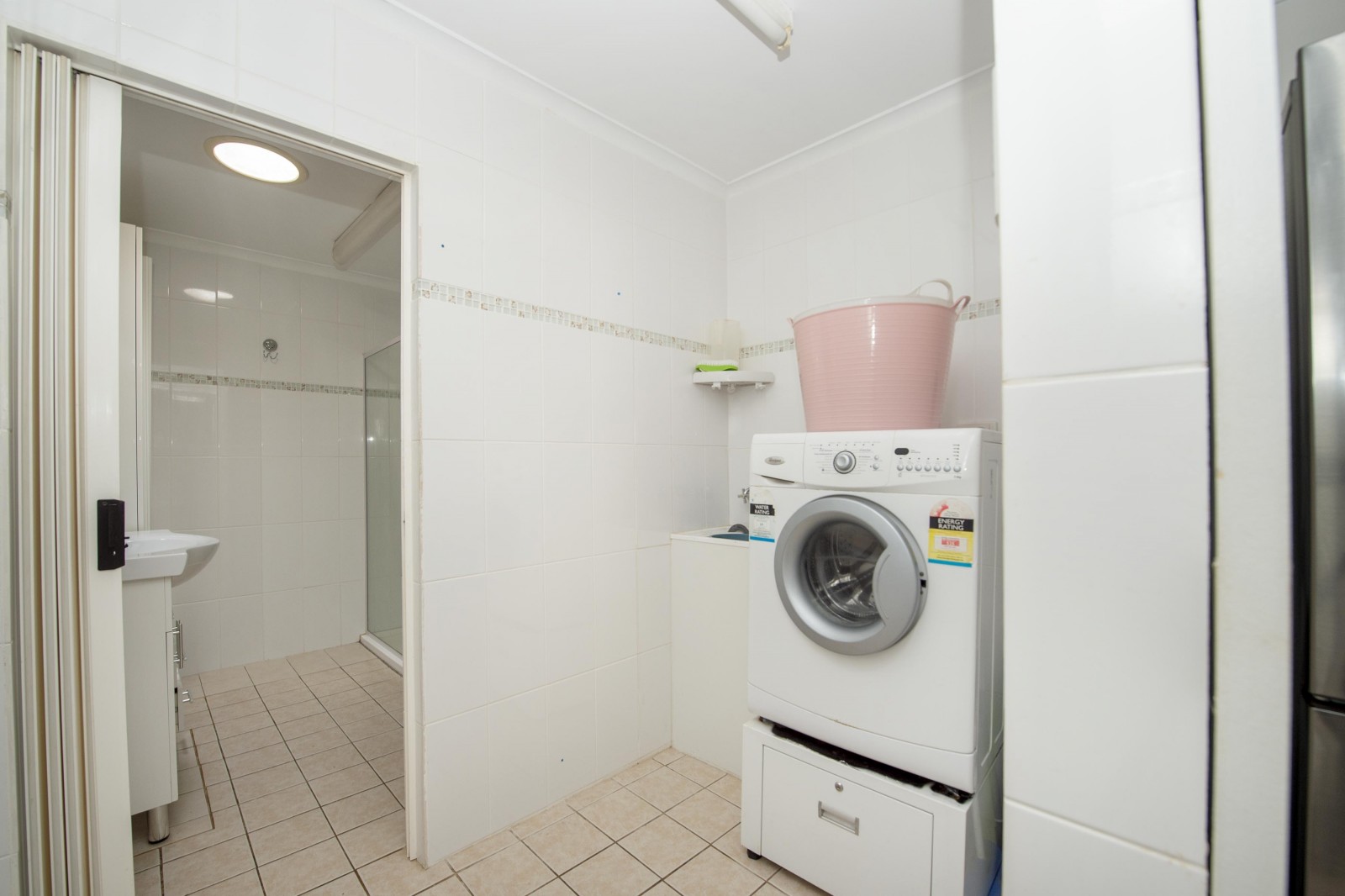 Wet areas are fully tiled and include a stylish bathroom with shower alcove, vanity, toilet and built-in storage, while the laundry is kept separate for added functionality.