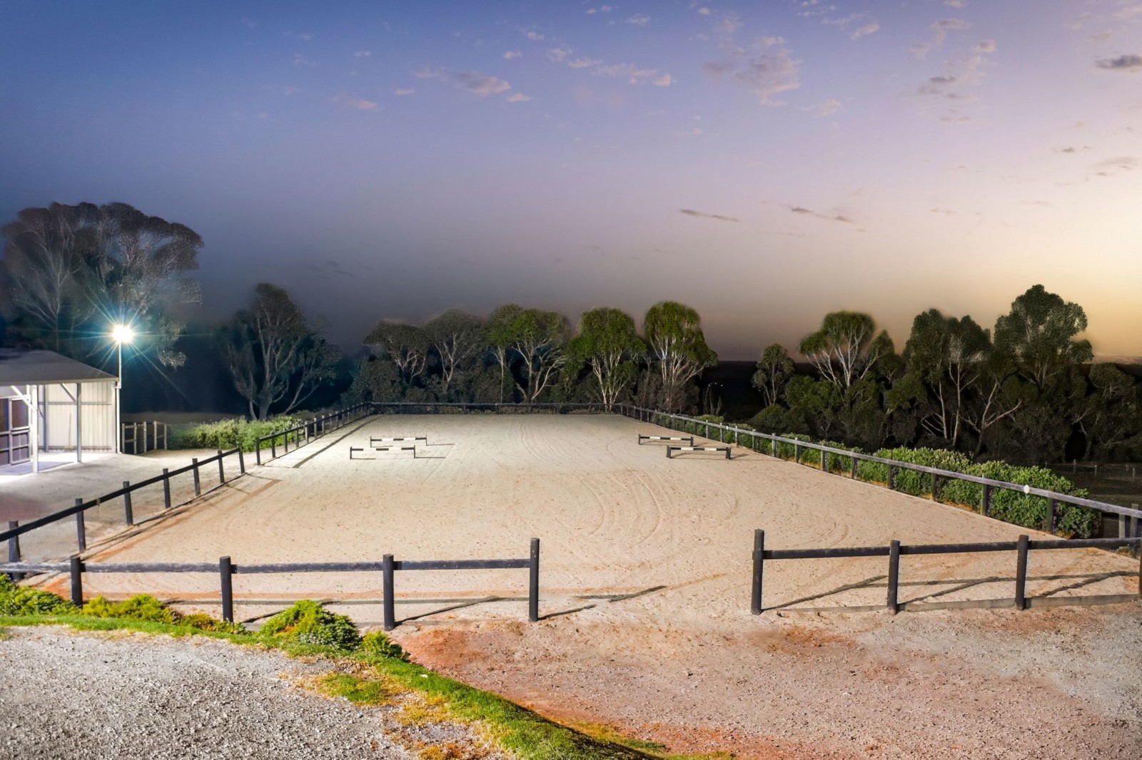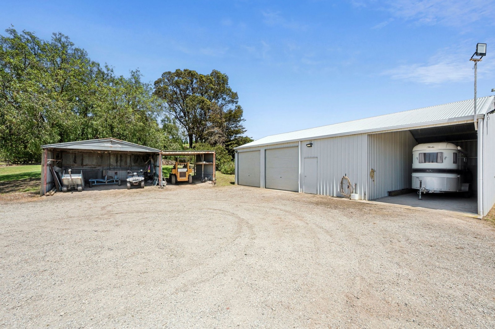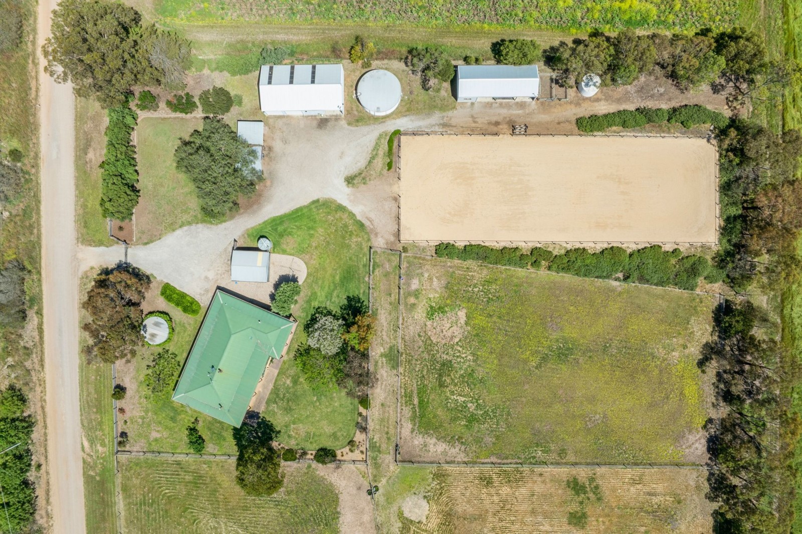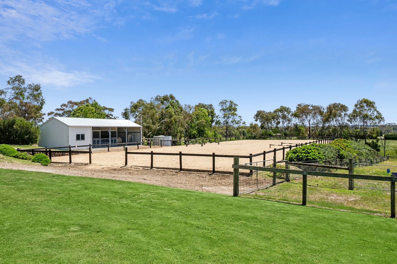 Established trees surround the property, which is divided into four main paddocks and includes 1 dam, an impressive floodlit 60m x 20m horse arena, horse stables (featuring 2 stalls, secured tack room and hay shed), 2 day yards, a four-bay shed comprising three enclosed bays (including two with roller doors) plus an open float/storage bay, a second two bay machinery shed, and approximately 190,000 litres of tank water storage.
