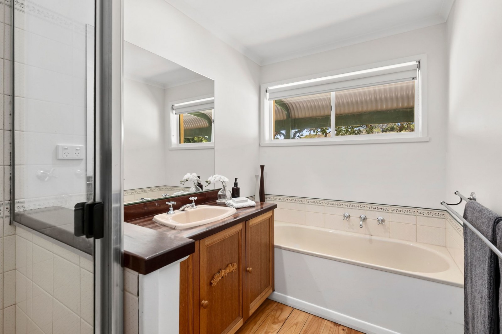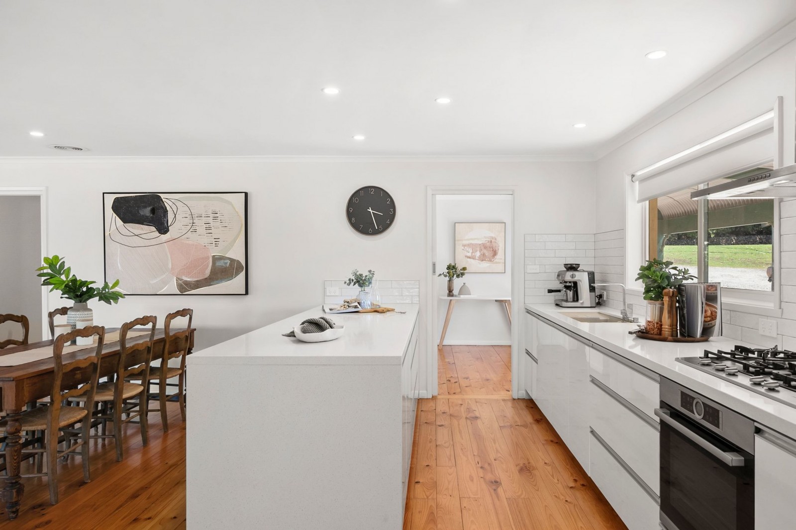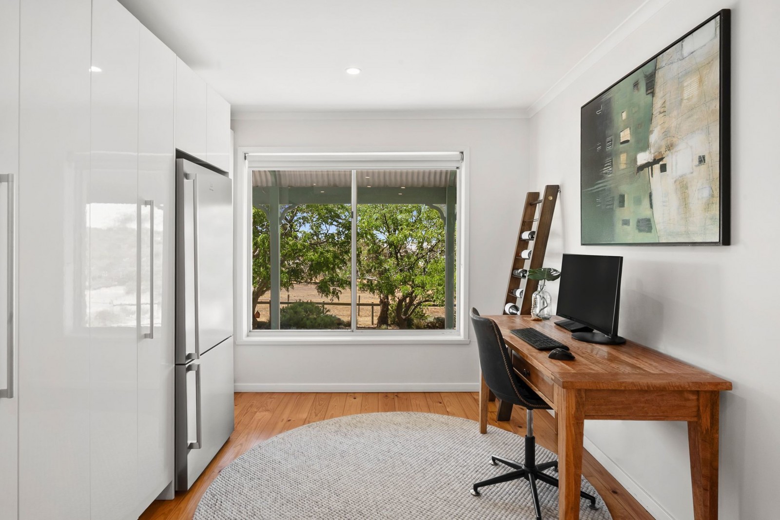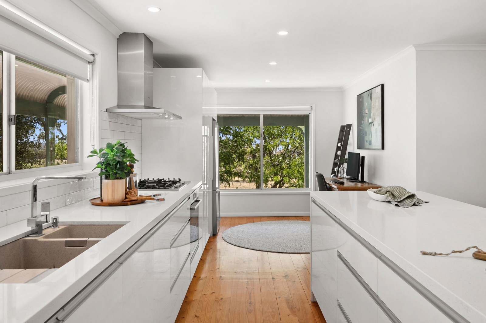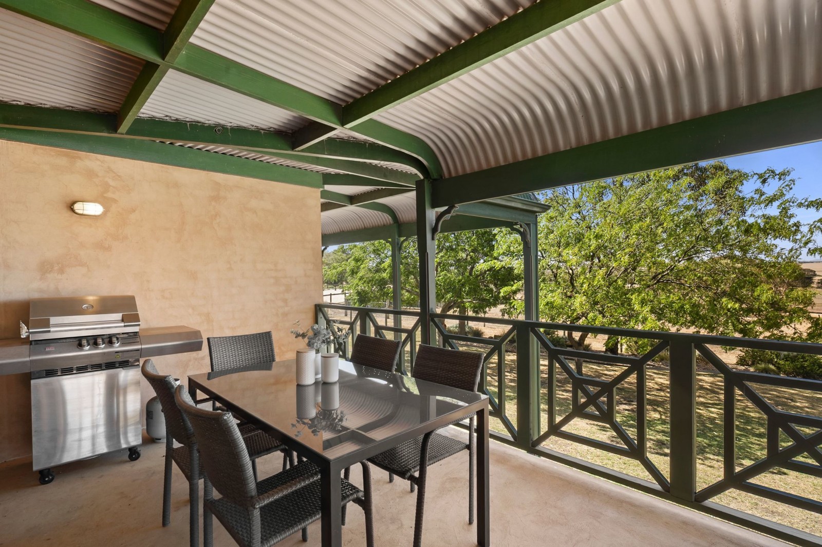 Surrounded by established gardens and mature trees, the homestead has been perfectly located in an elevated position and offers a renovated kitchen with stone benches, breakfast bar, pyrolytic oven, gas hotplates, dishwasher and an adjoining study/office space. This connects seamlessly through to the adjoining open plan dining/living area which enjoys sliding door access to the alfresco balcony, the perfect place to take in the magnificent countryside views over a morning coffee or an evening refreshment. The provision of split system heating and cooling and a Thorma wood fire (ducted throughout the house) adds to the rural ambience and increases the self-sustainability of the home.