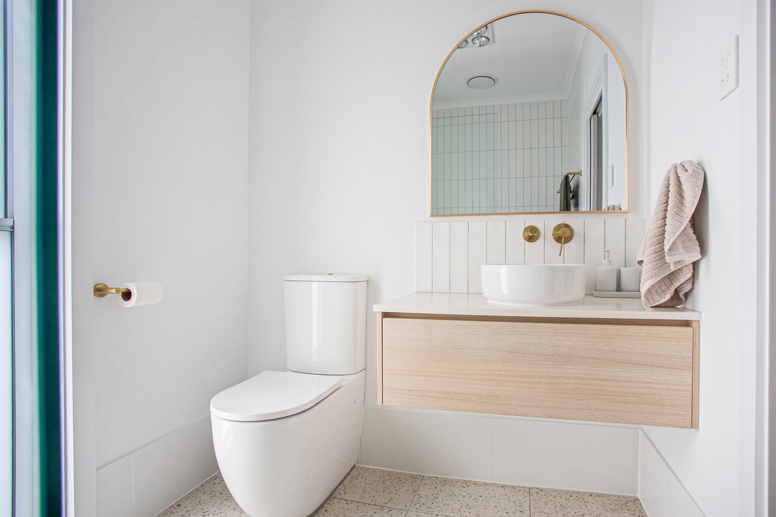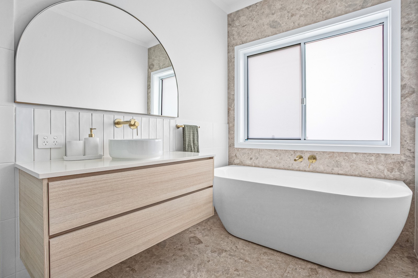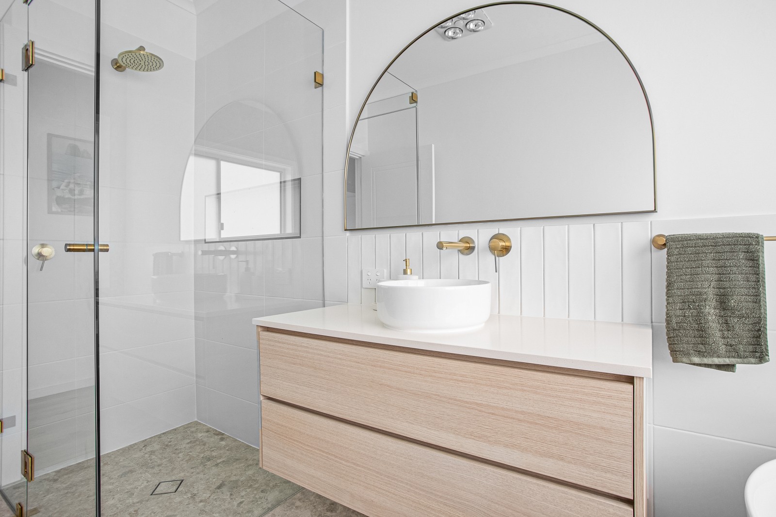 Three additional bedrooms are all well sized and include ceiling fans for year-round comfort. The main bathroom is equally impressive, showcasing striking gold accents, a back-to-wall freestanding bath, frameless glass shower screen and statement arch mirror.