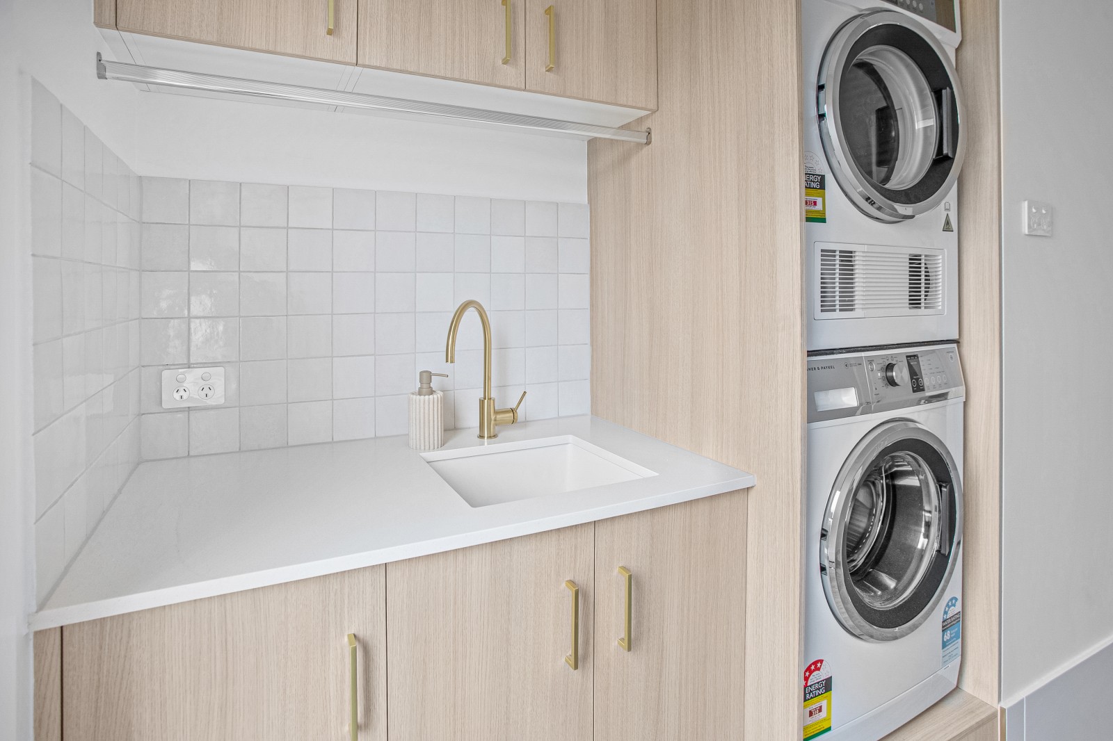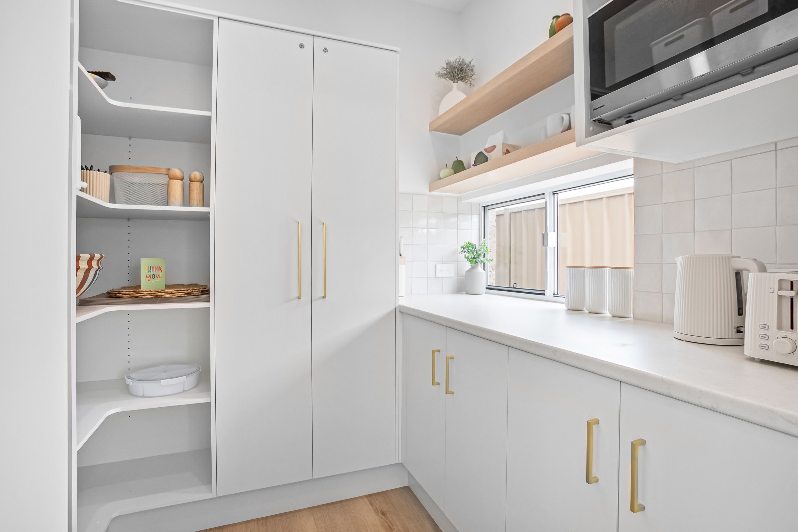 The kitchen has been designed with both functionality and style in mind, offering electric cooking, dishwasher, a large island bench and a generous walk-in pantry with extensive storage, including a lockable owner’s cupboard — ideal for those considering holiday rental flexibility.