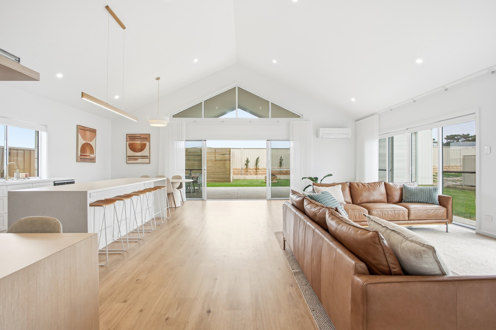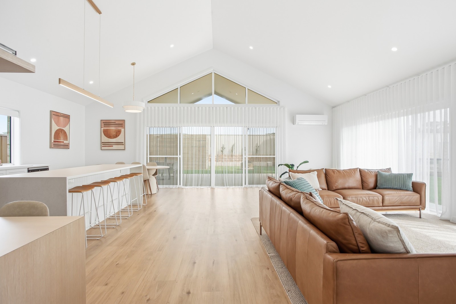 At the heart of the home lies the breathtaking open-plan living area. Designed to maximise light and space, this stunning room features soaring raked ceilings, highlight windows, feature lighting, floor-to-ceiling sheer curtains and warm timber-look flooring. A VJ panel feature wall adds texture and character, creating a space that feels both contemporary and inviting.