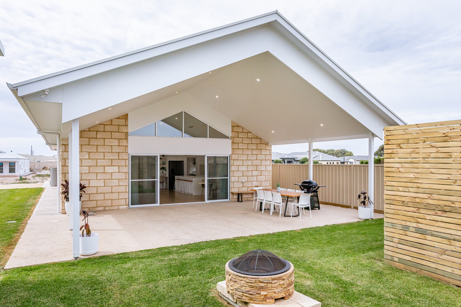 Sliding doors open to the expansive 9m x 6m outdoor entertaining area where the impressive raked ceilings continue, creating a seamless indoor-outdoor connection. Finished with exposed aggregate concrete and overlooking an established lawn, it’s the perfect place to unwind after a day at the beach or entertain family and friends.