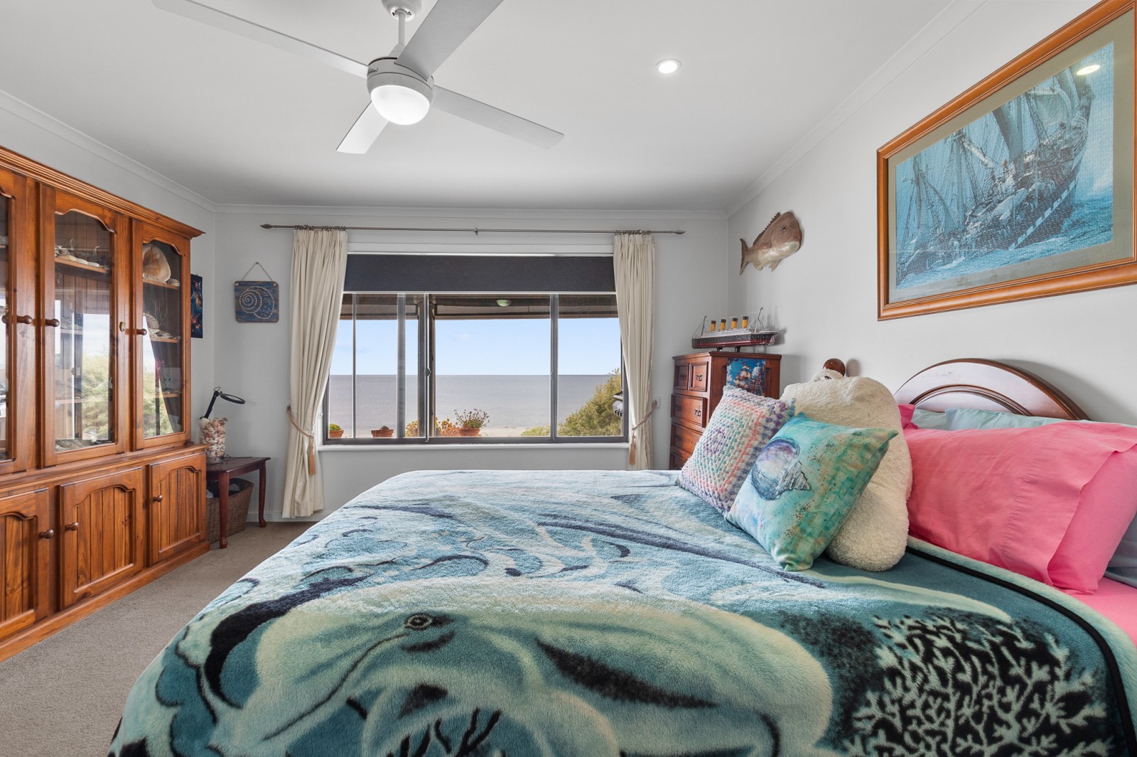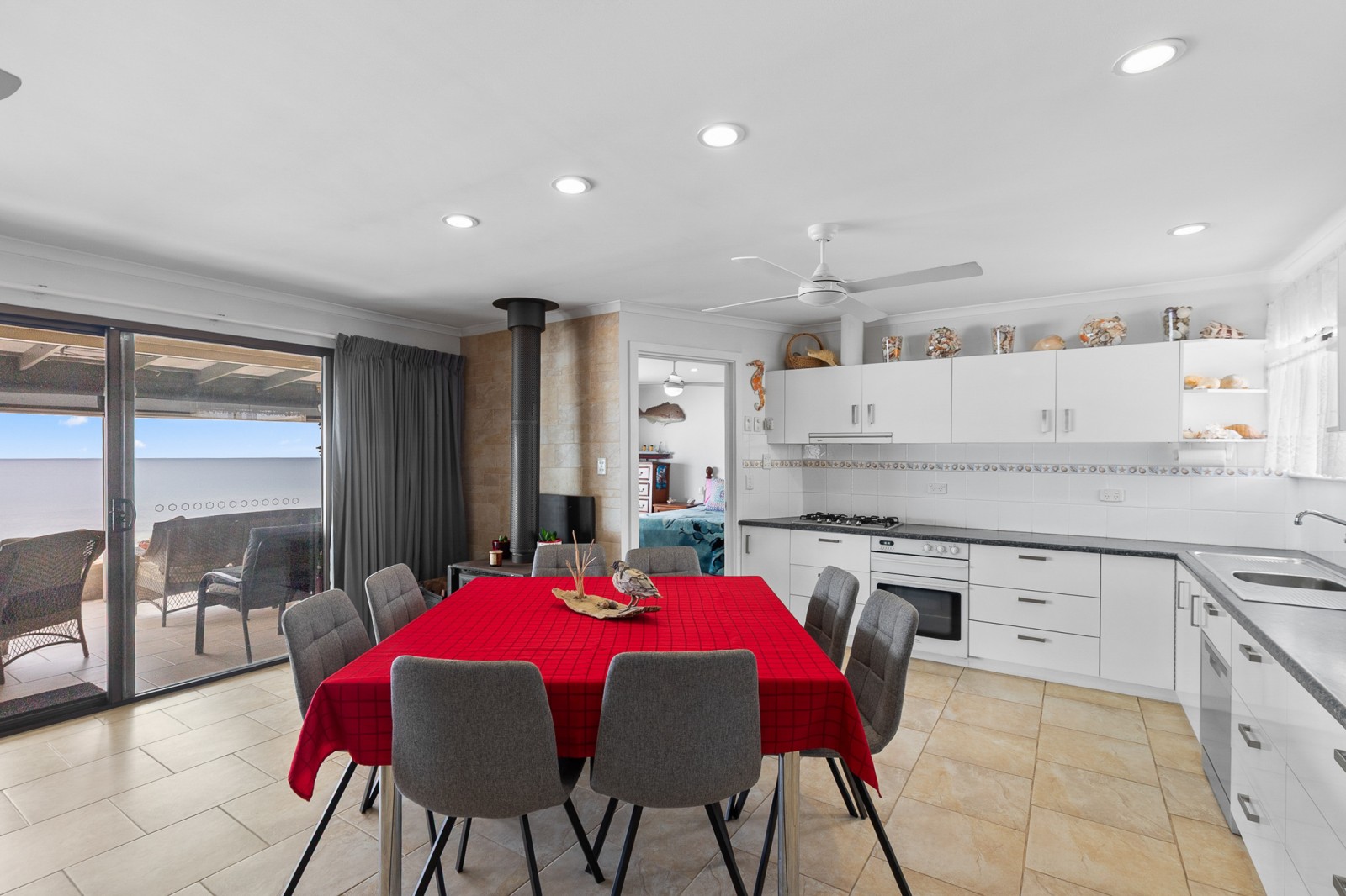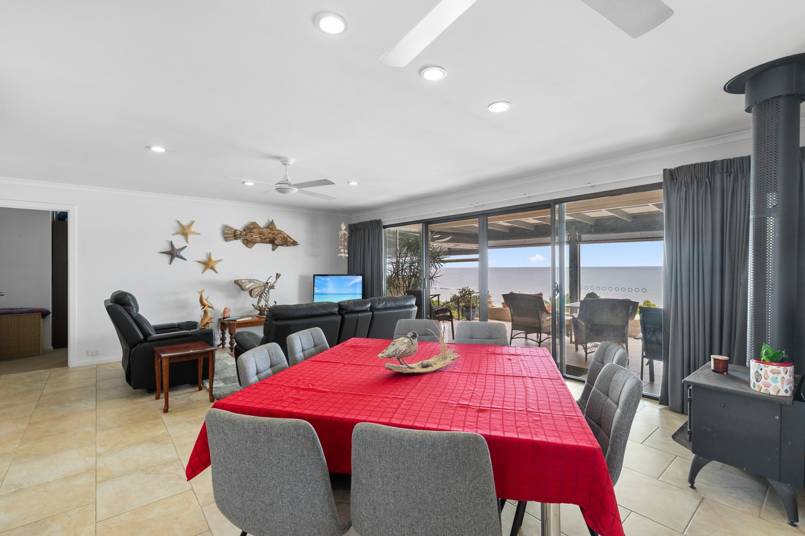- Open plan living area with ceiling fans, split system and cosy fireplace overlooking the ocean