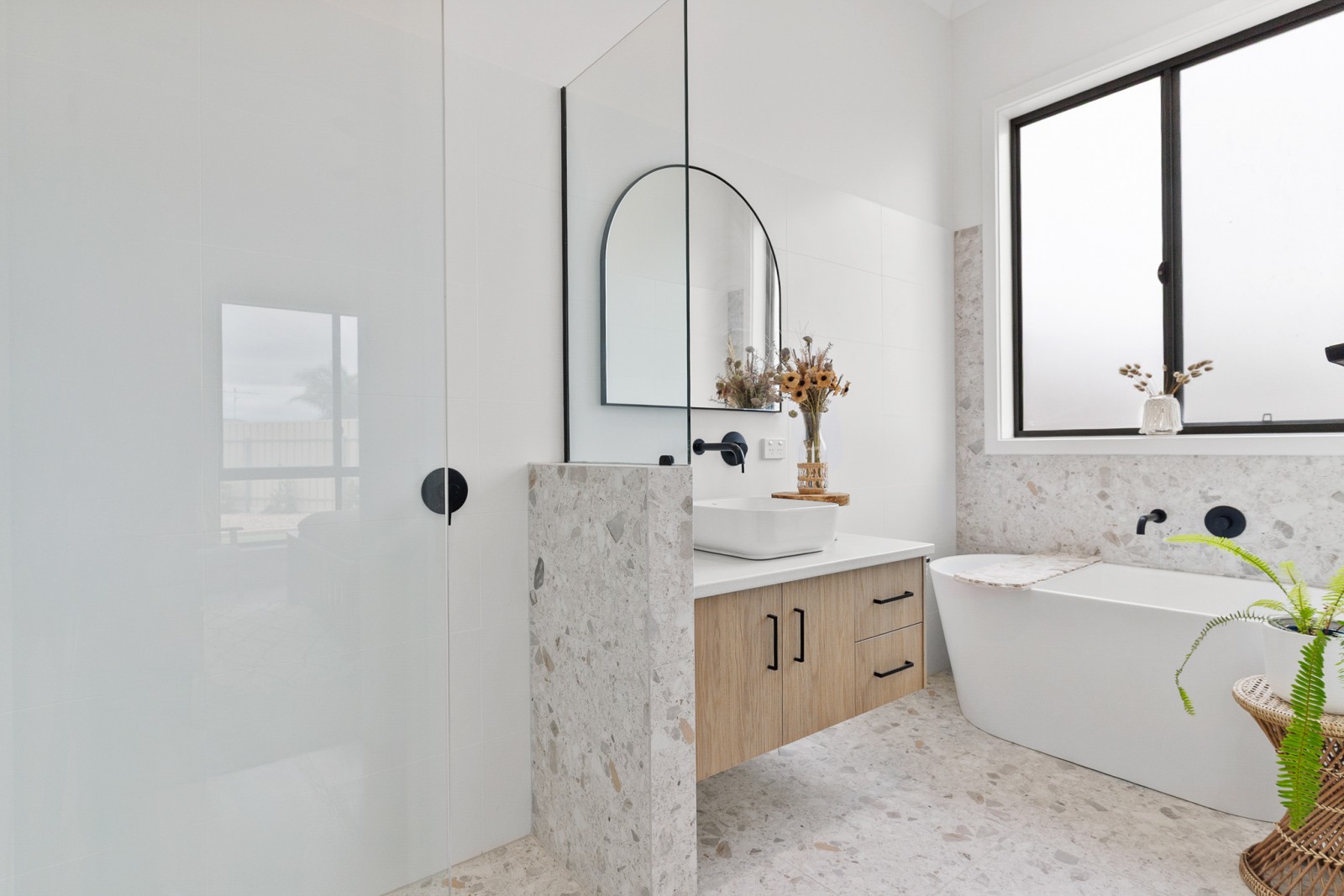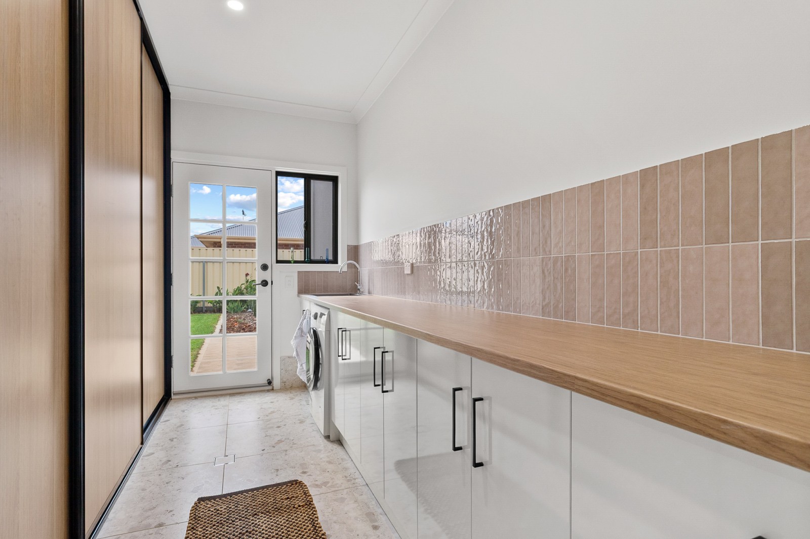 The main bathroom is stylishly finished with floating vanity, bath, shower, and separate toilet, while the large laundry features floor-to-ceiling built-in storage, bench space, and outdoor access.
