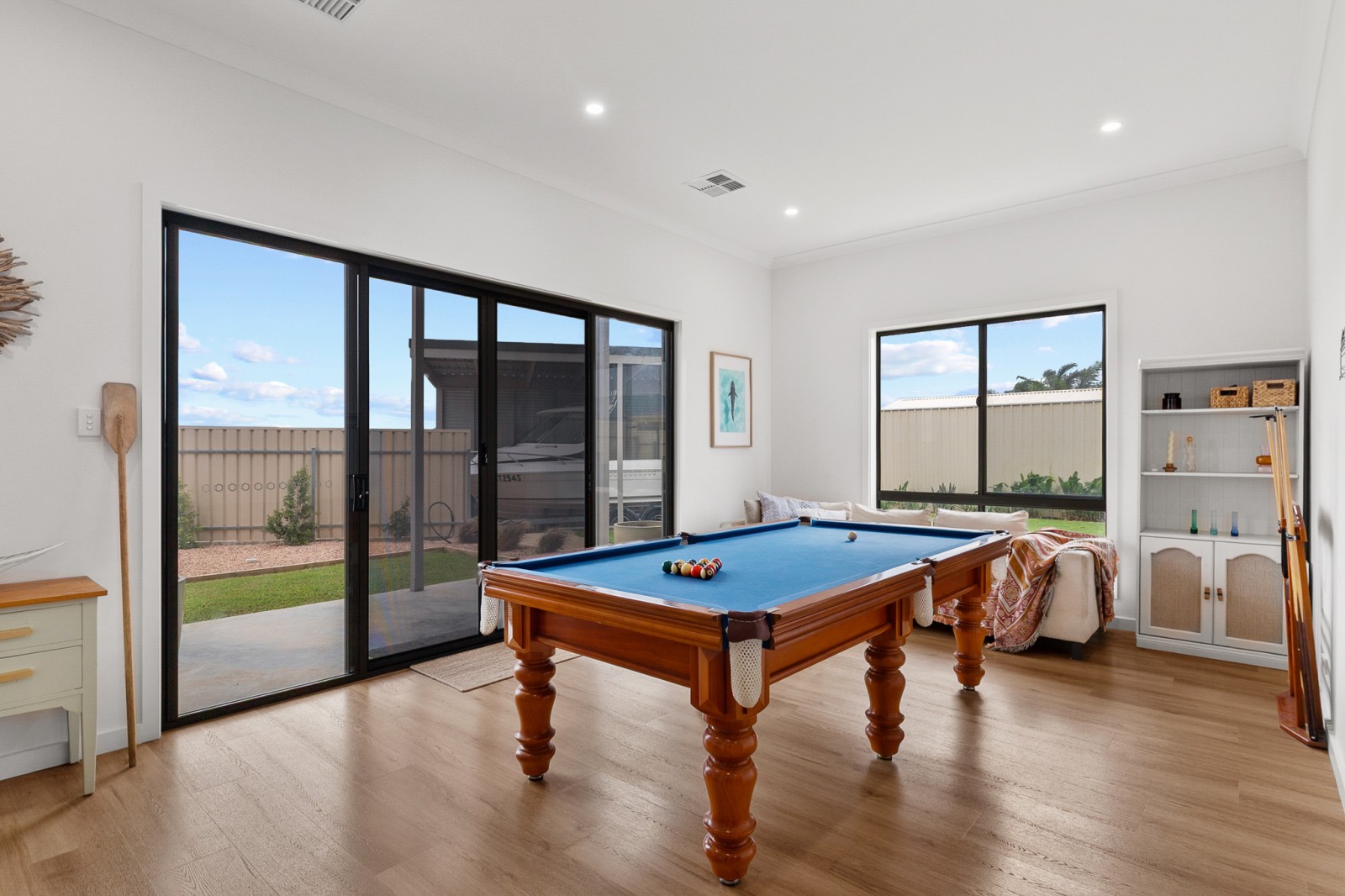 Downstairs provides excellent separation and versatility, offering two spacious bedrooms, a dedicated study, and a games room that seamlessly connects to the outdoor areas, perfect for growing families or guests. Hybrid flooring flows throughout the home, with carpeted bedrooms for added comfort.