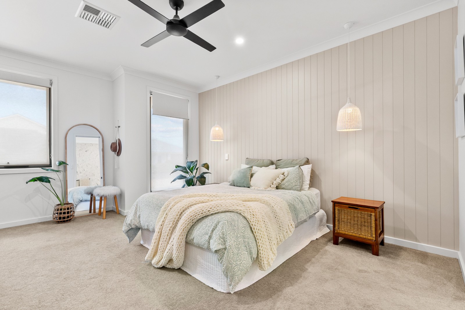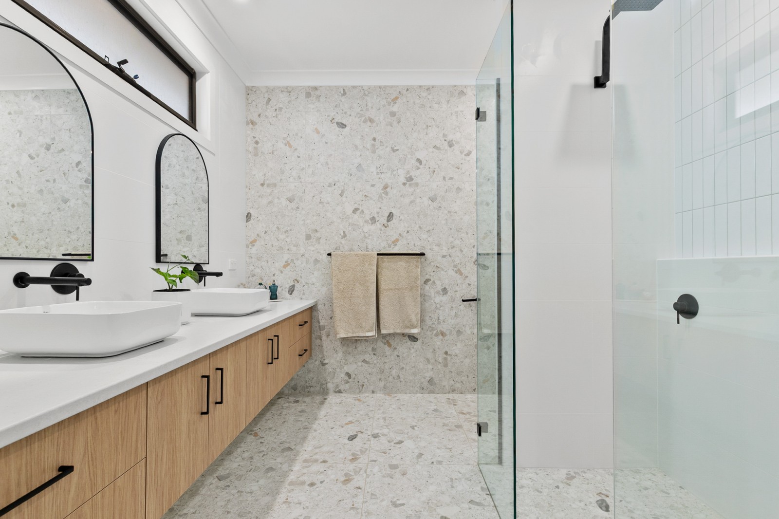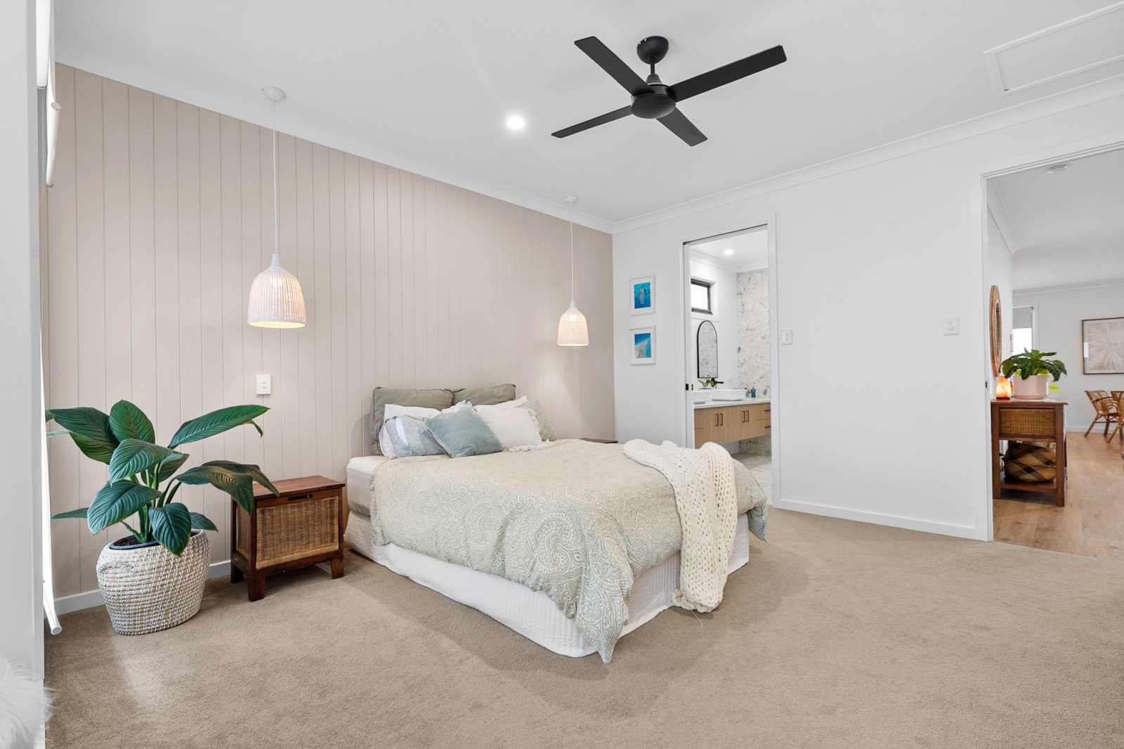 The generous master retreat offers a true sanctuary, complete with a large walk-in robe and a beautifully appointed ensuite showcasing floor-to-ceiling tiling, double shower, and floating vanity with dual basins. A third toilet with basin is conveniently located on the upper level.