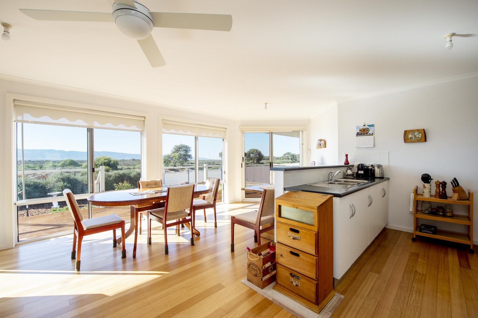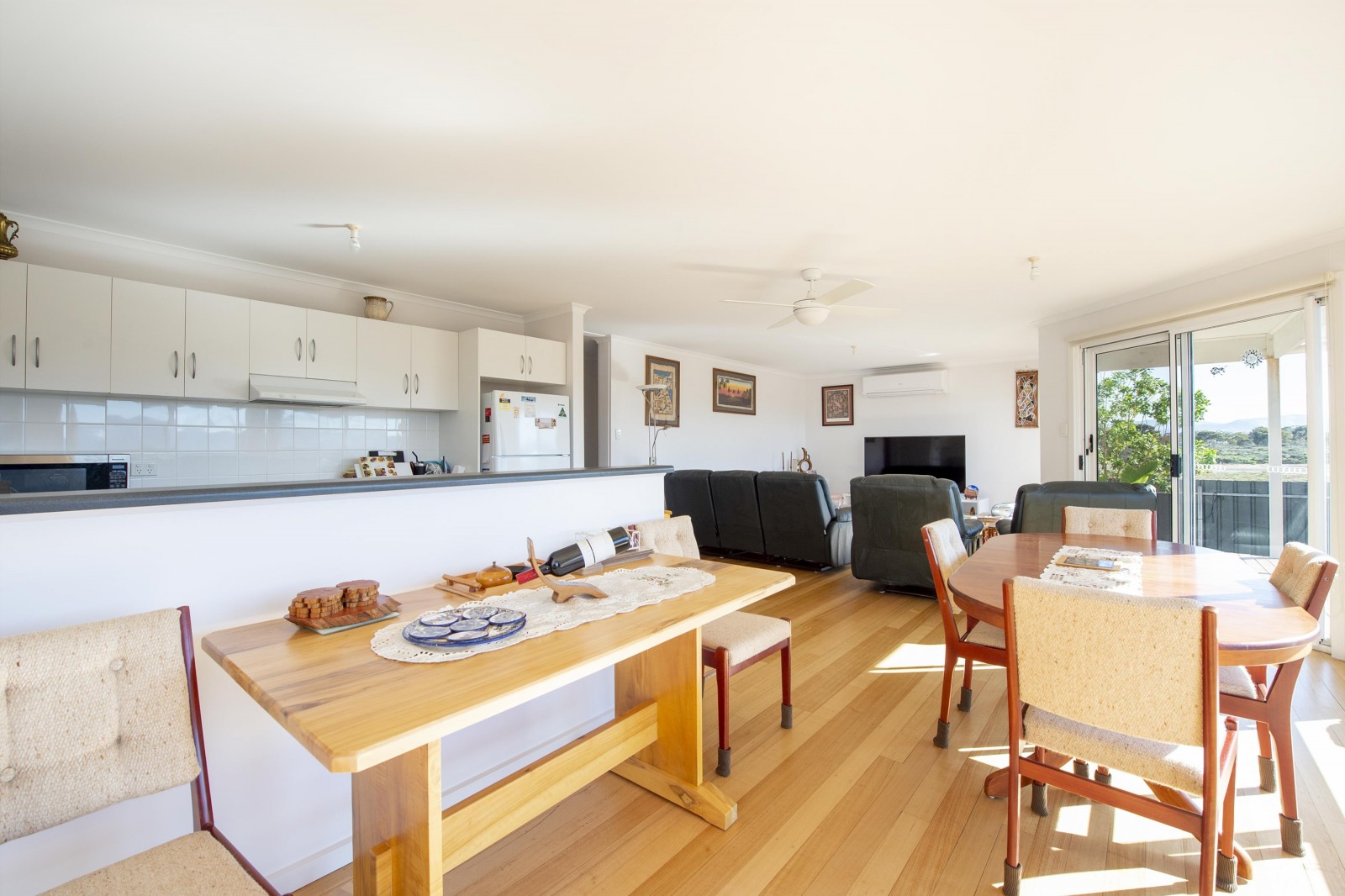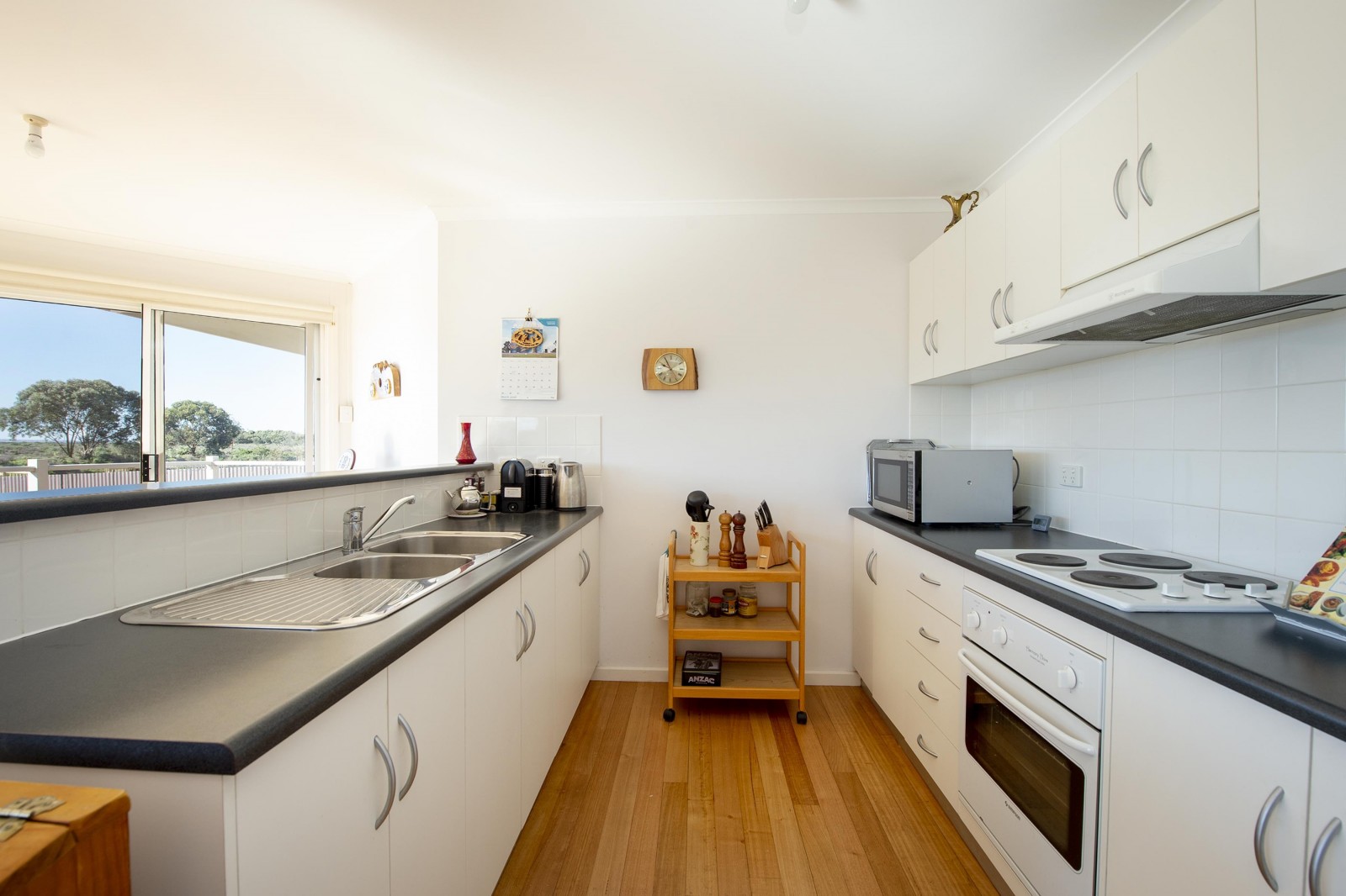 Step inside to a welcoming, light-filled living space featuring striking Tasmanian Oak flooring, creating warmth and character at the heart of the home. Designed for year-round comfort, the home includes ceiling fans throughout and a split system air conditioner. The galley-style kitchen is both functional and efficient, complete with electric cooking and ample storage.