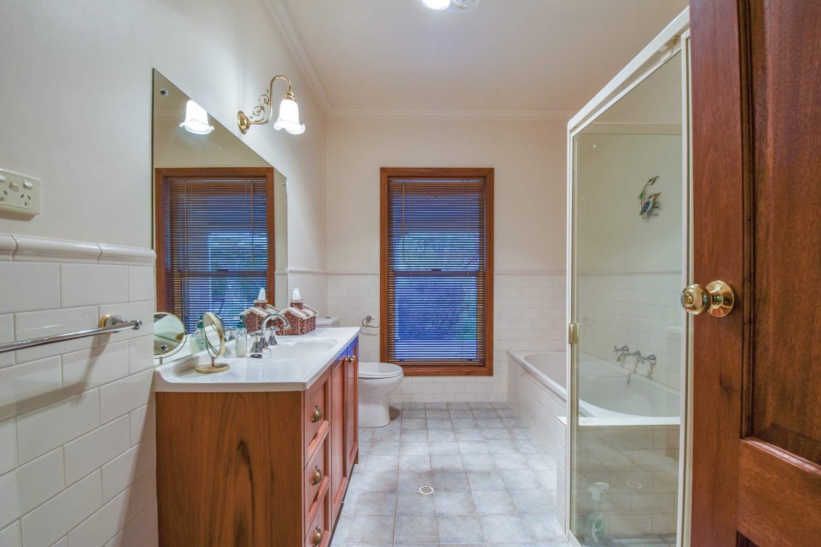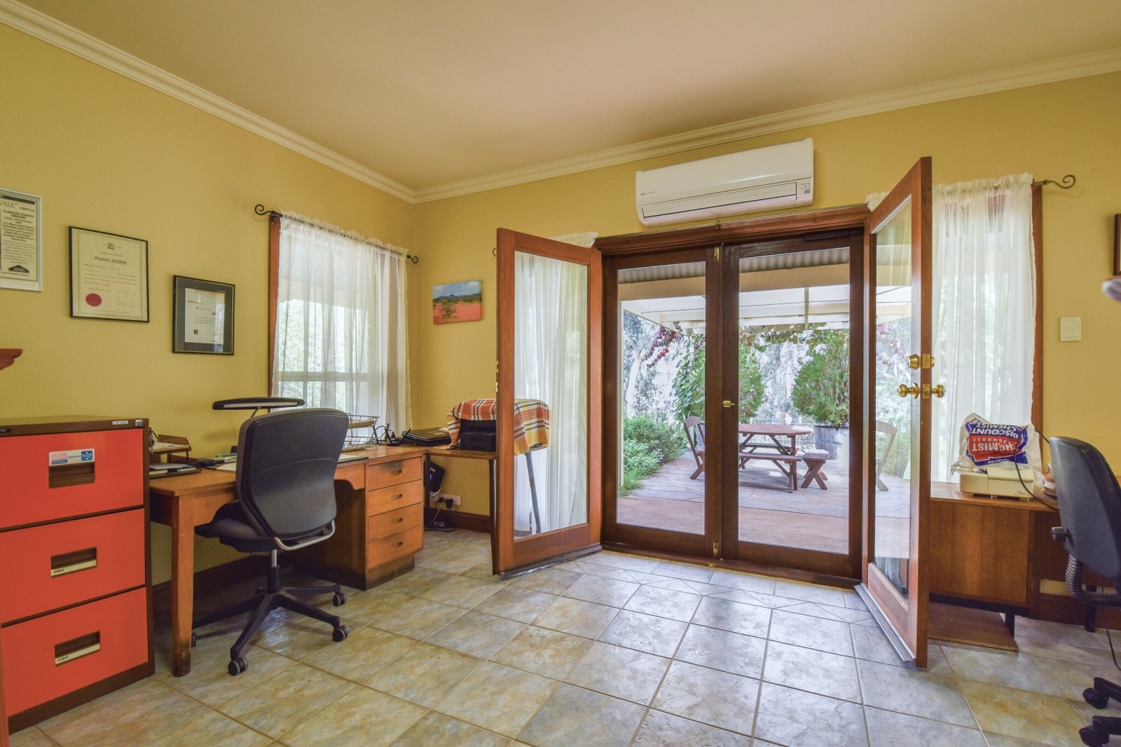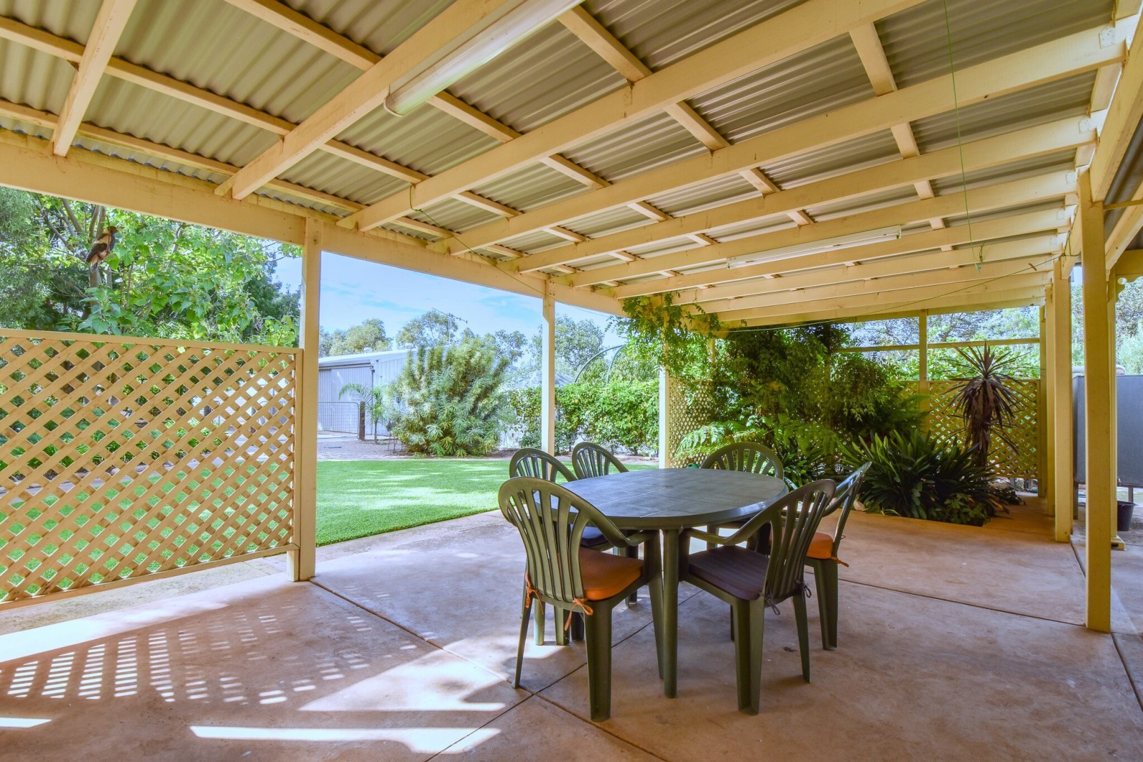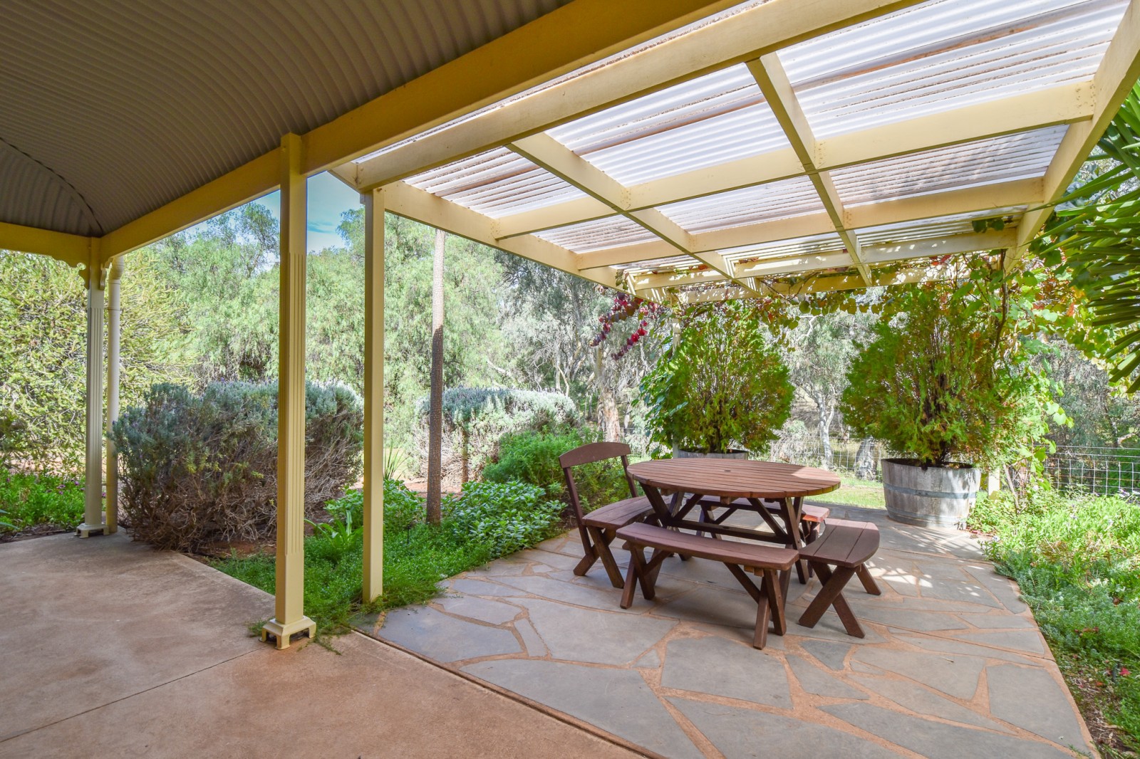 Outdoor living is well catered for, with an alfresco area overlooking established gardens, providing a practical space for entertaining or relaxing.