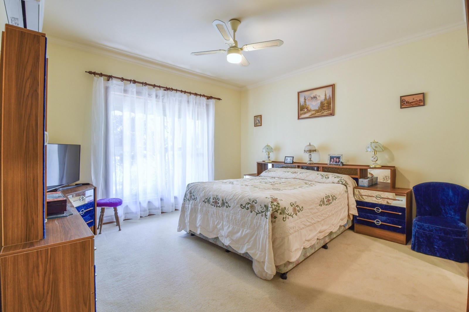 Two additional bedrooms are located toward the rear of the home, both well-sized and fitted with ceiling fans and carpet. The main bathroom services includes a shower, bath, vanity and toilet. Directly across is the laundry with large built in cupboard and stainless steel wash trough.