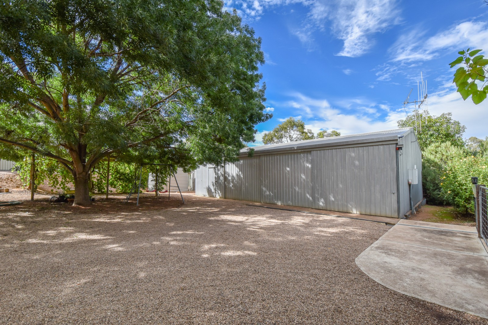 - The main shed measures approximately 14m x 12m* with 4m* clearance and includes a hoist, concrete floor, power, water, lighting and triple sliding doors, ideal for storing larger vehicles, a caravan or boat.