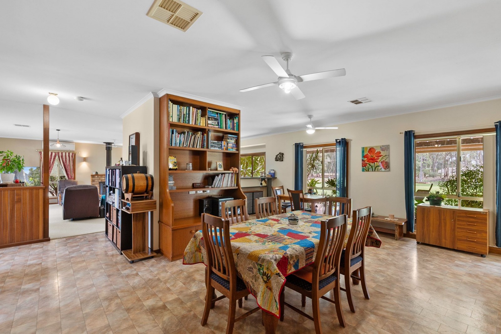 The grounds themselves are a standout feature, with established gardens and lawns that speak to the richness of the local soil. Extensive tree plantings ensure a ready supply of firewood for the cooler months, while a bore services the garden and rainwater tanks supply the home. Mains water is connected but seldom required a true testament to the property’s self-sufficiency.