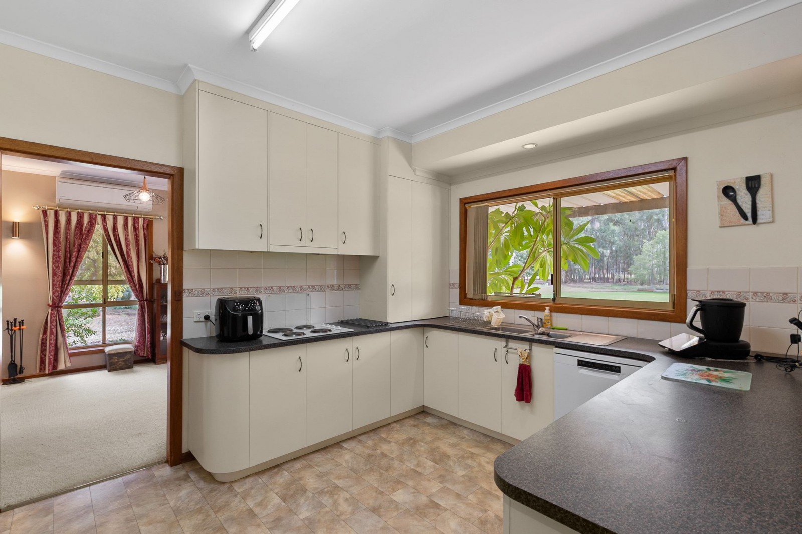 At the heart of the home, the kitchen is both practical and inviting, featuring ample preparation space, a wall oven, electric cooktop, and rangehood. The walk-in pantry is a welcome inclusion for the home cook, while the outlook over the backyard offers a tranquil, almost pastoral vista that feels far removed from the everyday.
