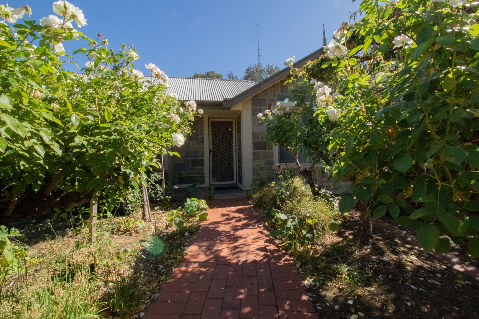 · Be greeted by a paved pathway leading to the home, beautifully lined with white roses that create an inviting and elegant first impression.
