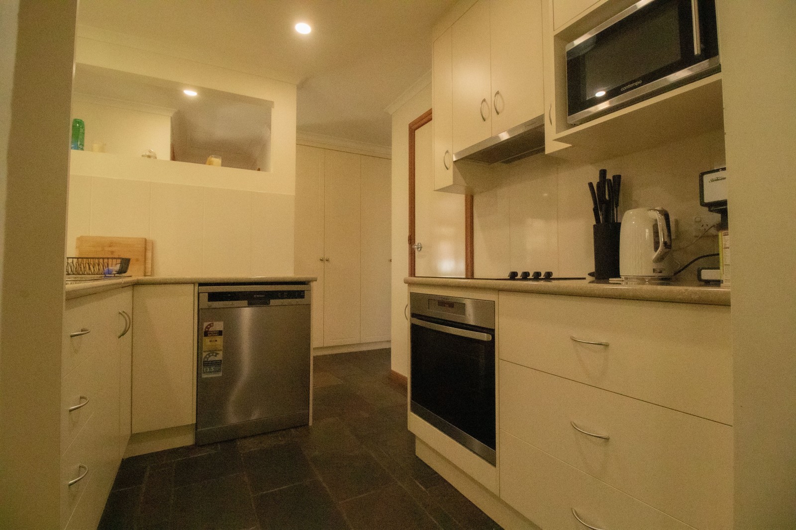 · The modern kitchen is centrally positioned and features an electric cooktop, dishwasher, double sink, and breakfast bar.