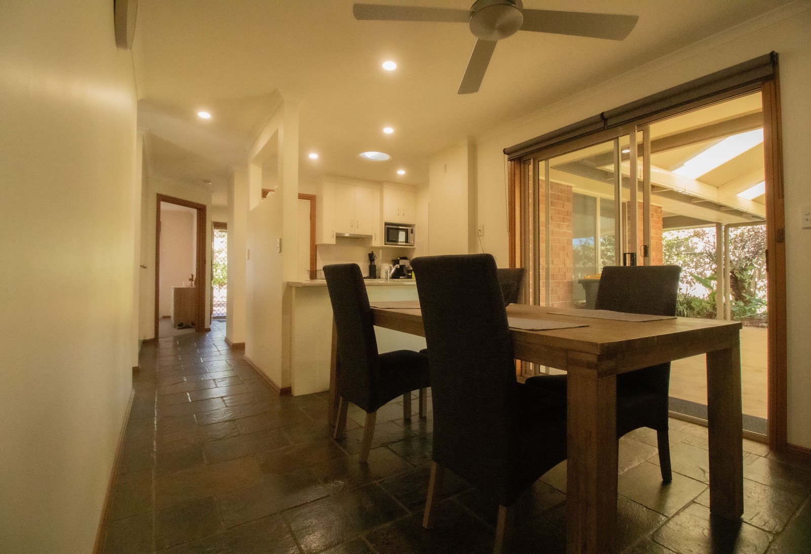 · Flowing seamlessly to the dining space, a light-filled area enhanced by slate tiles from the front entrance.