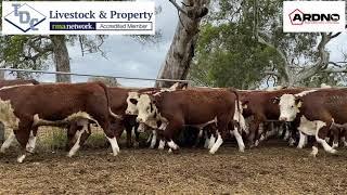 A Exceptional line of 45 March/April drop Hereford steers, weighed from 320-378kg to average 328.4kg curfewed. **EU accredited & PCAS Eligible** Antibiotic Free & Grass fed only. Properly yard weaned for 5 Days on Rye-Grass & Clover hay at assessment, then introduced back onto fresh spring pasture. These steers are out of large frame Hereford cow's, No money has been spared on genetics in this herd, Going back to the Ardno Performance Livestock and AI Genetics. Steers show good weight for age, have always performed well and been highly sort after. The Cleves family pride them self on quality cattle with first class temperament. Buy with confidence knowing these steers represent a great opportunity to either back round or grow out into bullocks. Please note vendor has 12 other lots in this sale. Vendor willing to help make numbers work with trucking.