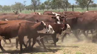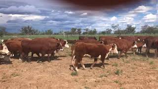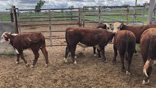 8 decks of Truro blood Hereford & Rayleigh HFD/Wavehill X Santa Cows & Calves, principally 2.5 to 5.5 years, with only 12 older. 3 cows with enlarged teat, 3 with old pink eye blemish, 1 with old cyst scar on cheek & 1 cow with long toe(see photo), The first calvers are the lightest in the mob, there are 7 bull calves with pink ears tags that ave 254kgs, 60 heifer calves & 42 steer calves. 109 calves avg 176 kgs. 7 small male calves were marked with a ring at assessment. The season is just turning & cows doing a great job on their calves. The vendor will be offering 4 Hereford bulls in the same sale.