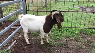 A good type Boer buck Exhibiting some better characteristics of the breed the owner has been using him in there operation and are happy with his kids weighed 1 hour off feed to AV 66kg the sire of this buck pedigree is in the photos.