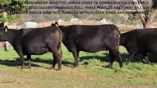 A WELL BRED LINE OF 4YRS PTIC ANGUS COWS TO COMMENCE CALVING EARLY JULY TO STUD DULVERTON ANGUS BULL. THESE FEMALES ARE FUNNY HILL & RENNYLEA ANGUS GENETICS. HANDLED WITH HORSES, DOGS AND MOTORBIKES. COWS WERE VERY SENSIBLE AROUND THE YARDS. COWS CARRY A GOOD FRAME SHOWING SOFTNESS AND A NICE TYPE. WILL BE VERY GOOD BREEDERS FOR A SUCCESSFUL PURCHASOR. ONLY SELLING AS VENDOR IS DOWN SIZING BREEDERS. ALL COWS WILL BE CHECKED BEFORE LOADING TO MAKE SURE EVERYTHING IS FIT TOO LOAD. GREAT OPPORTUNITY TO PURCHASE COWS THAT HAVE ALOT OF BREEDING TIME AND ARE VERY CLOSE TO START MAKING YOU MONEY.