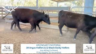 A/c Krongart Pastoral – 51 March/April 24 drop **PTE** heifers consisting of 39 Angus and 12 Angus/Herefords. All heifers were preg tested empty by a vet on the 21/08. **EU Accredited & PCAS Eligible**. Heifers were all weighed 420kg full plus to average 461kg empty at delivery. These cattle attract repeat buyers, showing good weight for age and have always performed well, they come with our highest recommendation. These heifers are bred to perform. They have been running on improved pastures and are very quiet heifers being a pleasure to handle. The Krongart cattle go forward and grow into heavy trade or export weights year in year out.