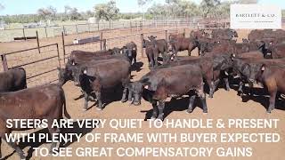 Buyers a line of 120 VGQ Angus Steers that are very well bred being purchased out of 'Tasmania' weaner sales in March 2025. Steers present with plenty of frame so would expect purchaser to see high compensatory gains on to fresh feed or grain. The vendor is very much up to date with all vaccinations having had 5 in 1, Bovilis MH + IBR, Liverflute, Selenium & a drench when purchased. Mouthed 10 steers at assessment all presenting with sound milk teeth. Steers are being offered $/head or C/kg weighed Quilpie Spell & Weigh with delivery date being 24/11/25. At assessment 7 x head were treated with terramycin Aerosol and 6 x head with small warts around head both not seen as any issues for buyer.