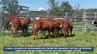A SMALL OFFERING OF ANGUS/HEREFORD X MIXED SEX WEANERS, THAT WILL BE OFFERED UNWEANED AND DELIVERED STRAIGHT OF THEIR MOTHERS. CALVES PRESENT IN FRESH SAPPY CONDITION, ARE PROGENY OFF LARGER FRAME CENTRAL WESTERN BRED COWS. THESE CALVES DISPLAY ALL THE BREED ATTRIBUTES, THOUGH ARE RED IN THE COAT, ARE EXTREMELY TYPEY, HENCE THE QUALITY. PLEASE SEE THEIR BLACK BALDY SISTERS/BROTHERS IN SAME SALE.
