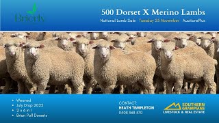 Brierly P/S have for sale and exceptional line of 1st X Bruan Poll Dorset X Willera Merino store lambs. These lambs are weaned, 2 x 6 in 1 Vaccinated and have been on exceptional quality improved Phalaris and clover. Brierly select their terminal genetics on growth and frame, and these lambs have that in spades. Please note this vendor has and line of 595 Merino wth lambs in the same sale.