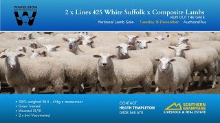 GR & MA WAKE are offering 2 lines of Exception quality White Suffolk X Composite store lambs. These lambs are pure Wakeleigh blood and have been weighed 100% 38.5-45kgs to be a very tight weight range. They will be sold in 2 lines of 425. These lambs have been trained onto 200grams per day of Heytesbury Stock feeds starter mix. They are renowned to grow into heavy export weighed lambs. Please note the vendor has another line of lighter lambs in this sale.