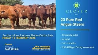 THESE STEERS WOULD BE IDEAL TO BACKGROUD AND THAN FEED ON GRASS OR GRAIN FOR THE TRADE OR FATTEN IN HEAVY EXPORT BULLOCKS. BACKED BY SOME OF THE BEST GENECTIS THE INDUSTRY CAN OFFER. VENDOR TAKES ALOT OF PRIDE AND CAREFUL SELECTION IN THERE BREEDING PROGRAM, WITH THERE FOUNDATION COWS COMING FROM YONDA GRANGE STUD (EARL DAKIN) AND ALSO PURCHAING ANOTHER LOT OF YONDA GRANGE AND PRINGA BLOOD HEIFERS.ALL THESE STEERS ARE AI SIRED BY DAHLKE OUTCOME AND FERGUSON STRONGHOLD. 295-392KG AV 341KG @ ASSESSMENT. 2 X 5 IN 1 VACC, MULTIMIN & DRENCHED.