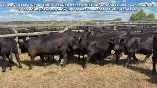 A VERY SMART LINE OF ANGUS WEANER STEERS TO AVG 273KG AT DELIVERY. STEERS SHOW GOOD LENGTH AND STAND ON GOOD BONE. OUT OF LARGE FRAMED COWS AND WILL PERFORM GIVEN THE OPPORTUNITY. BUYERS PLEASE NOTE THIS VENDOR HAS ADDITIONAL 39 HEIFERS IN THE SAME SALE.
