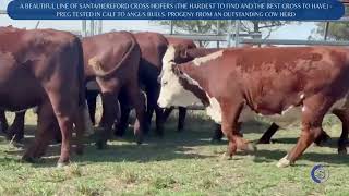 A BEAUTIFUL LINE OF SANTA/HEREFORD CROSS HEIFERS (THE HARDEST TO FIND AND THE BEST CROSS TO HAVE) - PREG TESTED IN CALF TO ANGUS BULLS. PROGENY FROM AN OUTSTANDING COW HERD, THATS NOW BEEN DISPERSED, THESE FEMALES ARE THE REAL DEAL. OUTSTANDING COSMETIC MAKE-UP, SOFT, FEMININE AND STAND ON GOOD BONE - FUTURE MATRONS IN THE MAKING. THESE HEIFERS WERE PRIMARILY SOURCED TO JOIN AND SELL, SUPPORTING THE BREEDER AND PROMOTING AND SHOWCASING THE 'LOTUS HEREFORD BRAND' - AND HERE IS THE PROOF!!